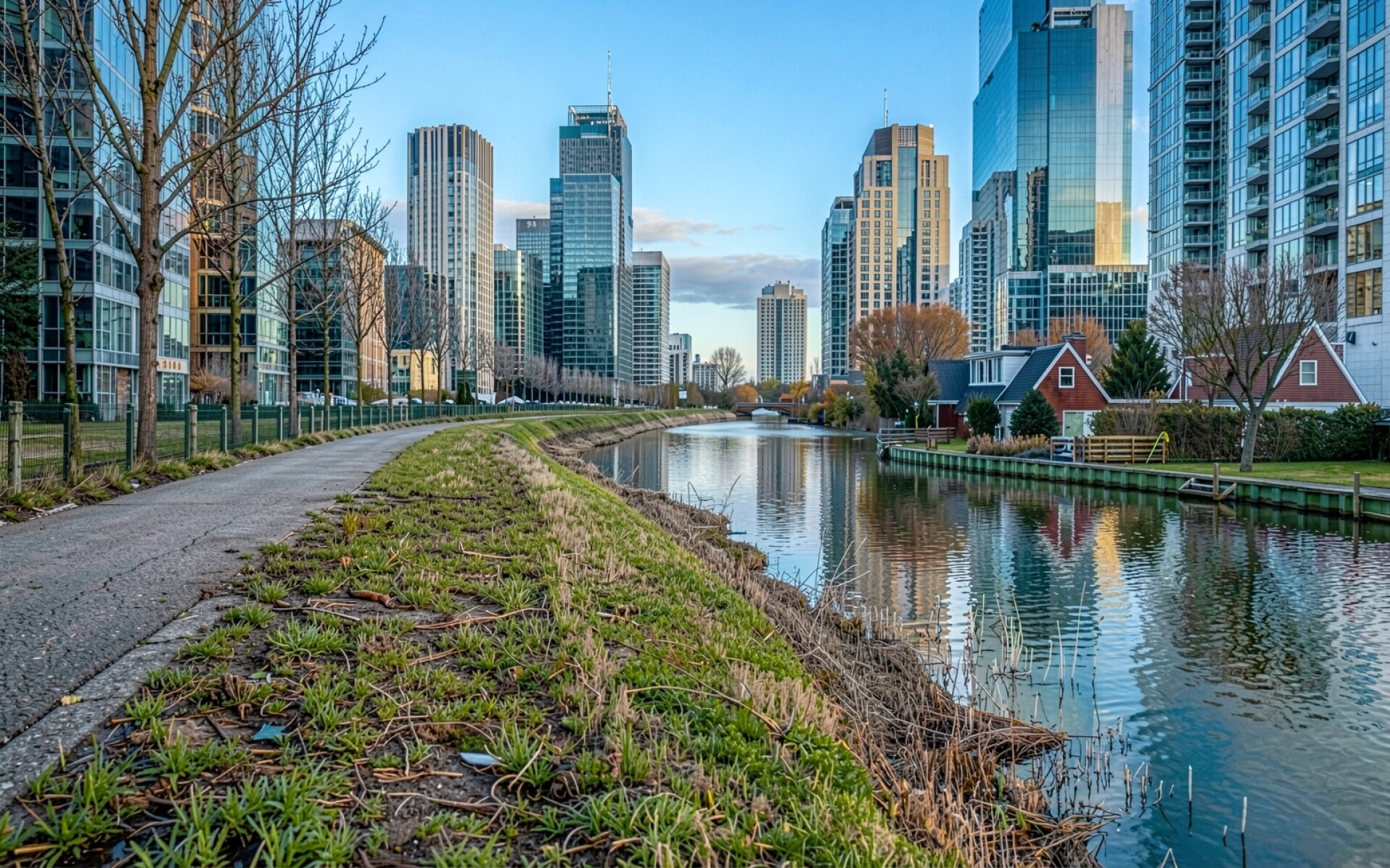 Техническое исполнение кадра подчеркивает контраст между природной текстурой береговой линии и гладкими поверхностями стеклянных фасадов. Освещение имитирует мягкий предзакатный час, создавая глубокие отражения зданий в зеркальной поверхности воды и плавные градиенты на небе. Четко проработаны тени в нижней части кадра и блики на металлических конструкциях архитектурных объектов. На сайте доступен удобный предпросмотр перед загрузкой, чтобы оценить качество отображения на вашем экране.