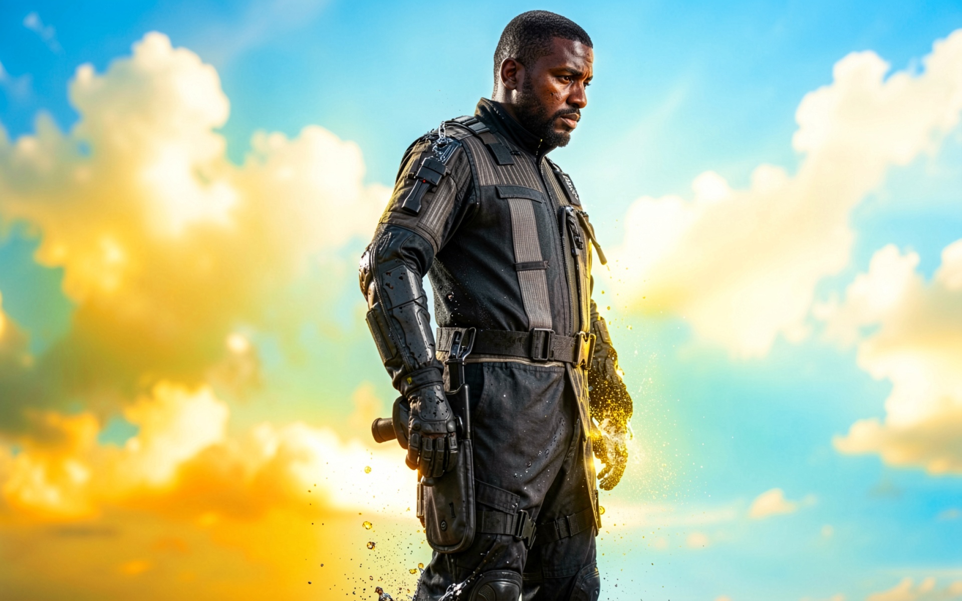 Изображение детально передает текстуру тактического материала костюма и матовые поверхности защитных элементов. Освещение создает выразительные блики на плечах и глубокие тени в складках ткани, подчеркивая объем фигуры. Градиент неба переходит от насыщенного синего к яркому золотистому, создавая контрастный контур вокруг персонажа. На сайте доступен удобный предпросмотр перед скачиванием для оценки качества на экране.