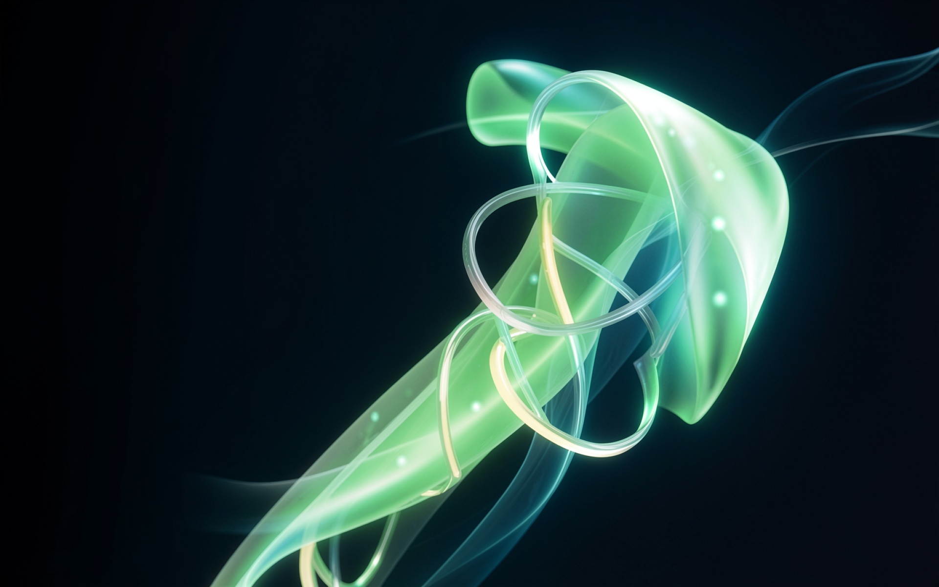 Изображение характеризуется плавными градиентами изумрудного и лаймового оттенков, которые создают эффект неонового свечения. Текстуры линий имитируют полупрозрачное стекло или энергетические потоки с четкими бликами в точках изгиба. Контраст между глубоким черным фоном и яркими акцентами подчеркивает объем композиции и динамику световых переходов. На сайте доступен удобный предпросмотр перед скачиванием, чтобы оценить качество отображения на вашем экране.