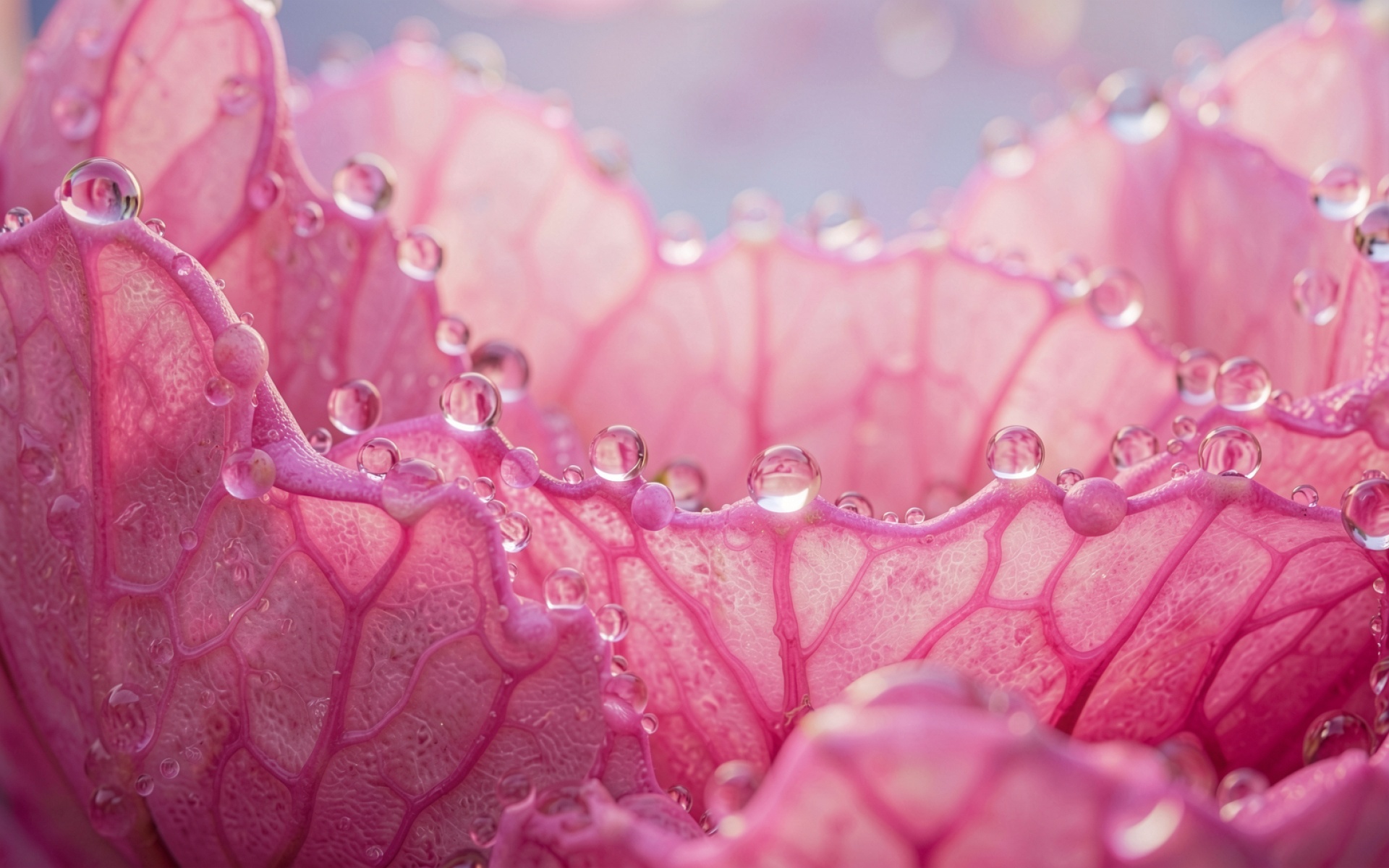 Техническое исполнение кадра подчеркивает органическую текстуру лепестков и тонкую сеть прожилок. Освещение создает мягкие градиенты от насыщенного розового к светлому фону, а сферические капли росы работают как линзы, создавая четкие блики и глубокие тени. На сайте предусмотрен удобный предпросмотр перед загрузкой для оценки качества отображения на вашем экране.