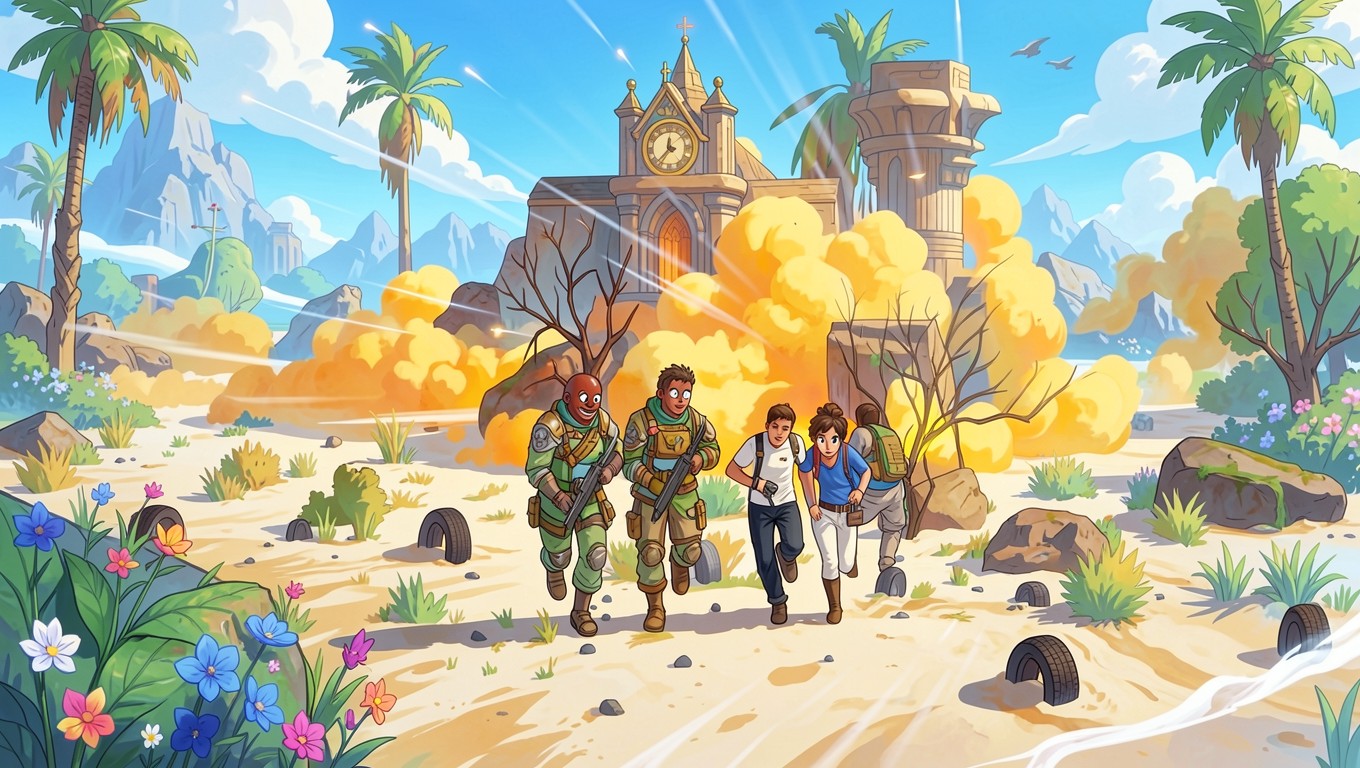 Изображение отличается детальной проработкой текстур песка и растительности. Освещение имитирует яркий полуденный свет, создавая четкие контрастные тени под персонажами и глубокие блики на элементах архитектуры. Градиенты неба плавно переходят от насыщенного голубого к светлому горизонту, а дымные шлейи за спинами героев имеют мягкую растушевку. На сайте доступен удобный предпросмотр перед загрузкой для оценки качества отображения на экране.