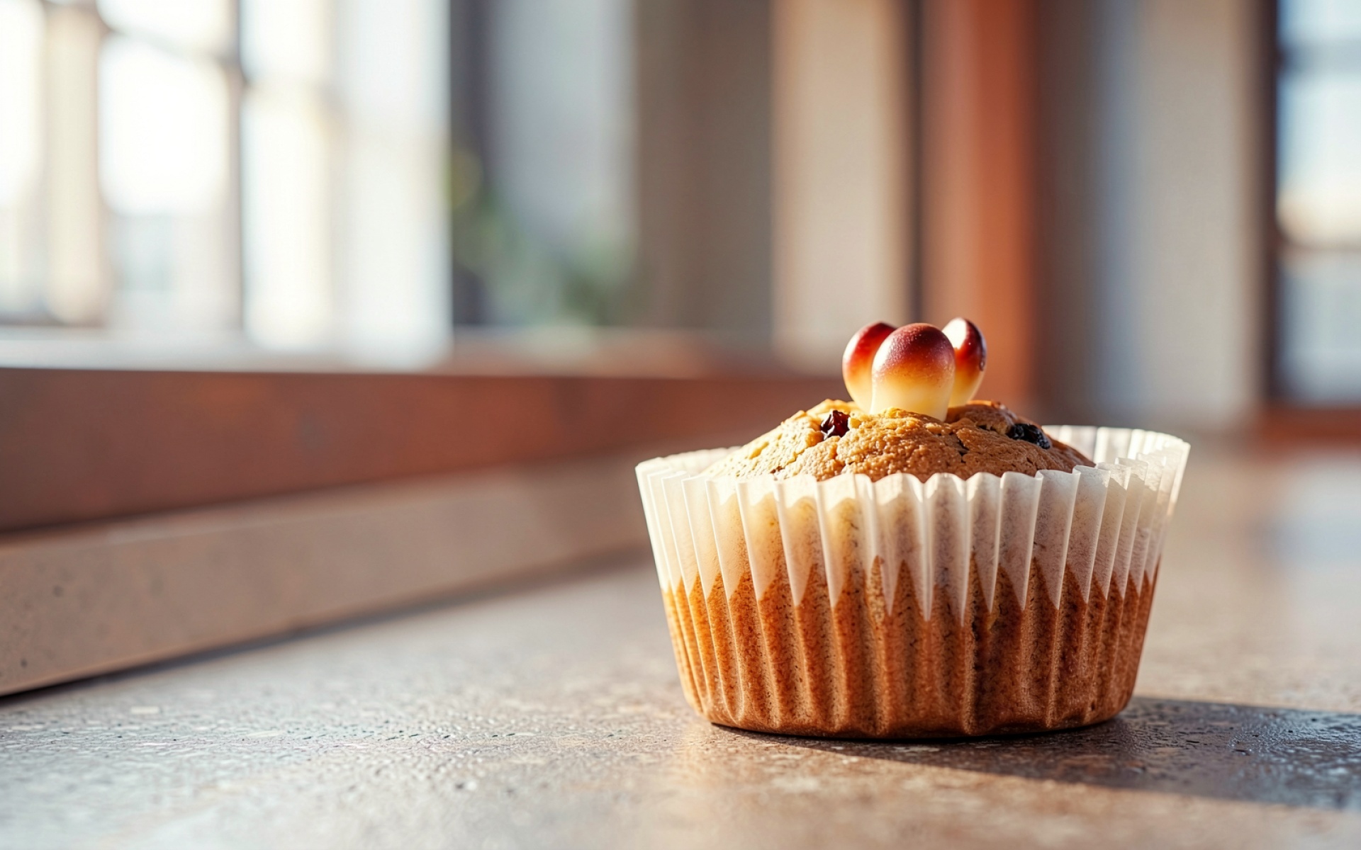 Эту картинку можно скачать в высоком разрешении для использования в качестве фона рабочего стола или в дизайне фуд-блогов. Изображение демонстрирует детализированную текстуру выпечки, бумажную форму и естественное освещение из окна, создающее мягкий контраст на серой каменной поверхности.