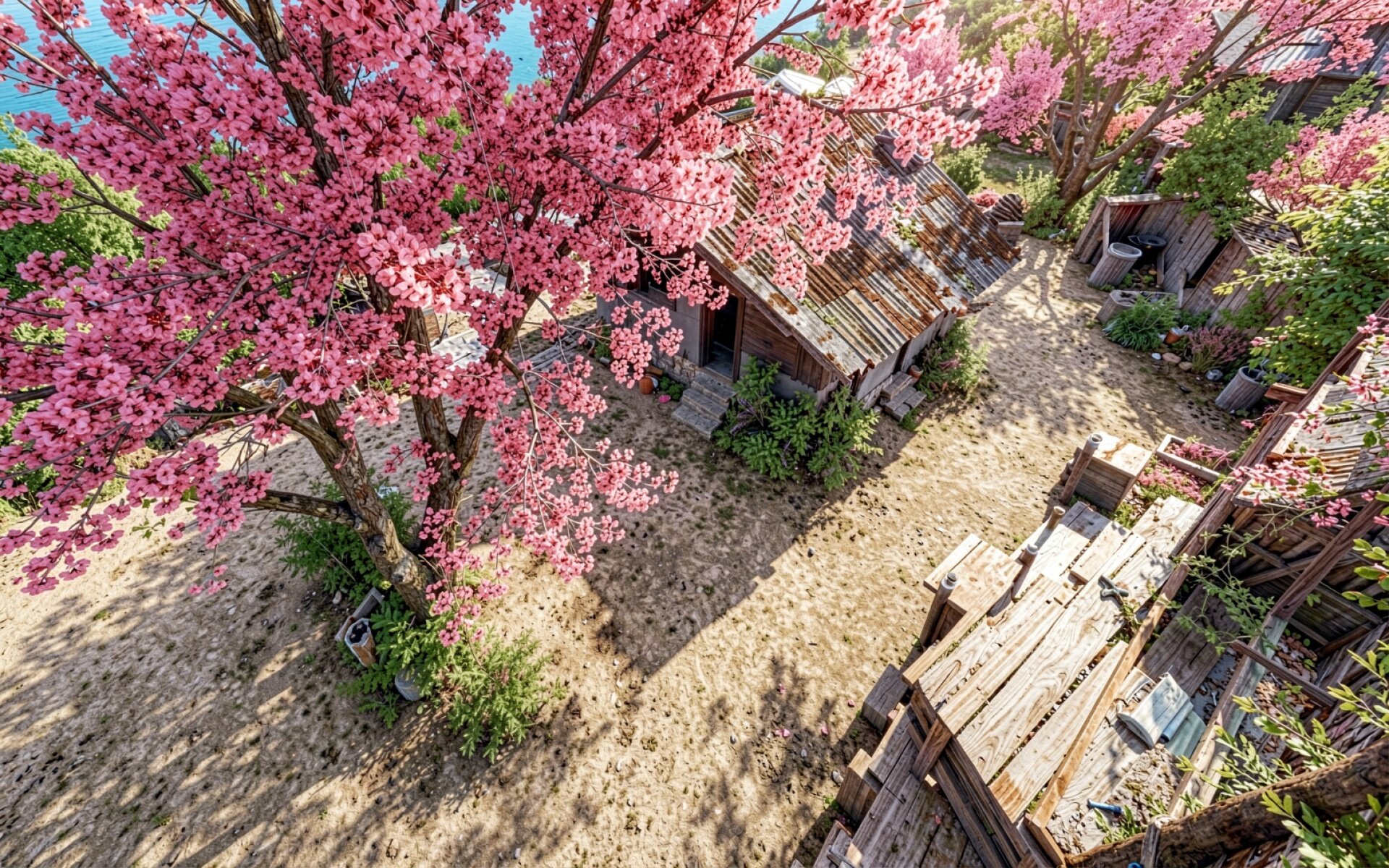 Техническое исполнение кадра акцентирует внимание на контрасте между органическими формами розовых лепестков и грубой текстурой состаренного дерева. Освещение создает мягкие градиенты в тенях под кроной дерева, а яркие блики подчеркивают объем каждой ветви. Фон с элементами прибрежной зоны дополняет композицию естественными переходами тонов. На сайте предусмотрен удобный предпросмотр перед скачиванием, чтобы оценить качество отображения на вашем экране.
