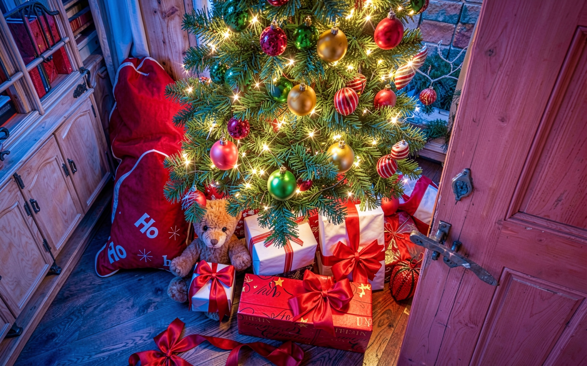 Изображение детально передает текстуру хвои и глянцевую поверхность елочных шаров. Мягкое освещение от гирлянд создает теплые блики на упаковочной бумаге подарков и ворсе плюшевого мишки. Глубокие тени в углах комнаты контрастируют с яркими акцентами красного цвета, а плавные градиенты фона подчеркивают объем предметов. На сайте доступен удобный предпросмотр перед загрузкой для оценки качества на экране.