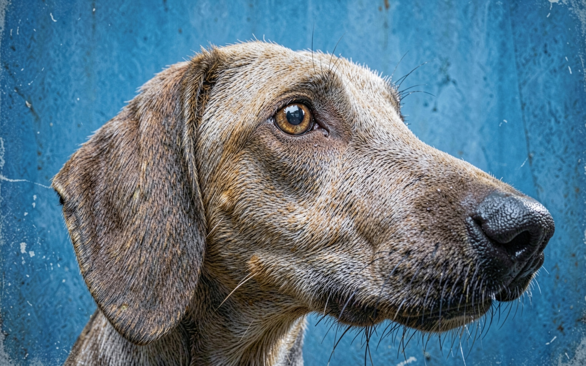 Изображение детально передает текстуру короткой шерсти и влажный блеск носа животного. Контраст между теплыми коричневыми оттенками морды и холодным синим градиентом заднего плана создает выразительный объем. Освещение подчеркивает каждую складку кожи и отдельные волоски, создавая четкие блики в глазах. На сайте доступен удобный предпросмотр перед скачиванием для оценки качества на экране.
