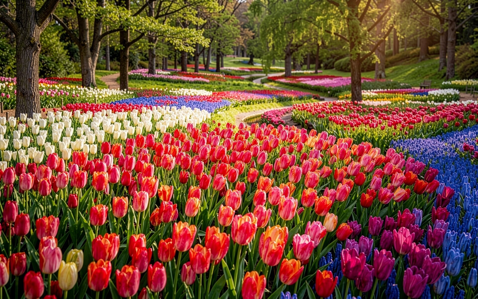 Поле разноцветных тюльпанов в солнечном весеннем парке обои