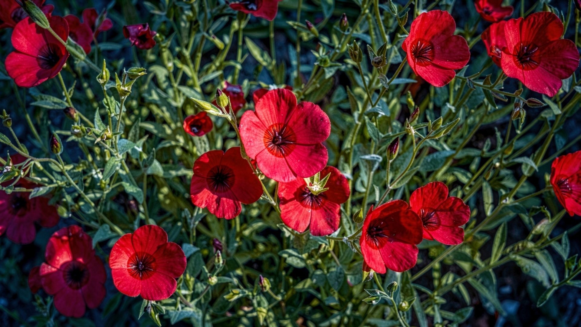 Изображение характеризуется насыщенным алым оттенком лепестков с глубокими тенями в центре каждого цветка. Текстура растительности передана через контраст между глянцевыми поверхностями листьев и матовым покрытием бутонов. Освещение создает четкие блики на краях стеблей, а градиент фона плавно переходит от темно-зеленого к глубокому серому. На сайте доступен удобный предпросмотр перед загрузкой для оценки качества на экране.