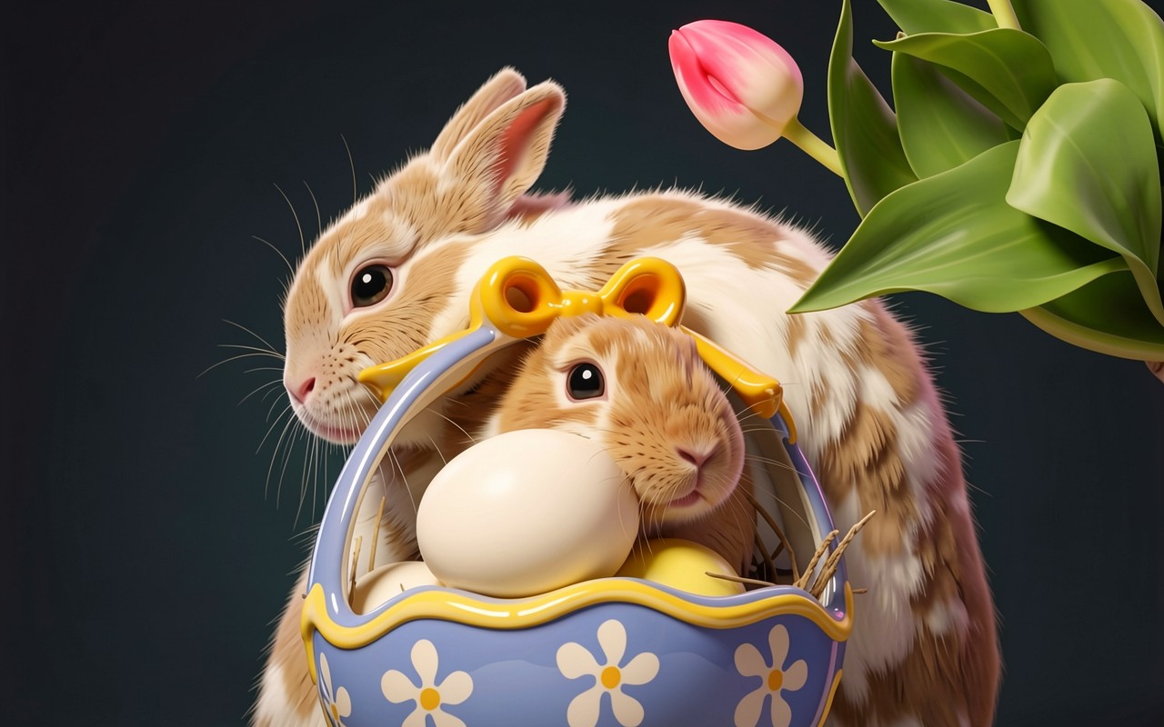 Композиция выполнена в стиле цифрового гиперреализма с акцентом на текстуры: ворсистый мех кроликов, гладкая поверхность пасхальных яиц и матовый лепесток тюльпана. Цветовая гамма базируется на контрасте теплого бежевого и глубокого темного фона, что выделяет центральные объекты. Технически изображение оптимизировано под современные мониторы с поддержкой широкого цветового охвата. Согласно данным color-age.com, правильный баланс насыщенности и яркости в цифровых иллюстрациях напрямую влияет на визуальное восприятие глубины пространства.