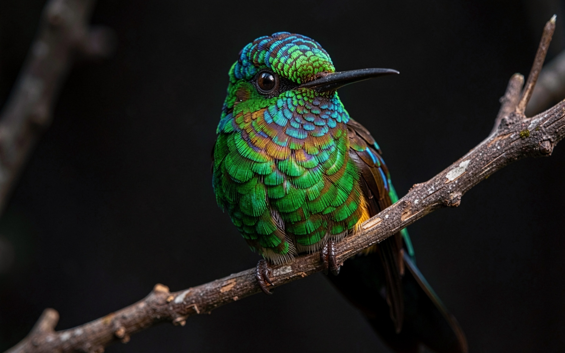 Изображение детально передает структуру оперения птицы, где каждый блик подчеркивает металлический блеск перьев. Контрастное освещение создает четкие границы между насыщенным зеленым цветом и глубокими тенями заднего плана. Плавные градиенты на ветке дополняют общую композицию, создавая эффект объема. Перед загрузкой доступен удобный предпросмотр для оценки качества отображения всех элементов на вашем экране.