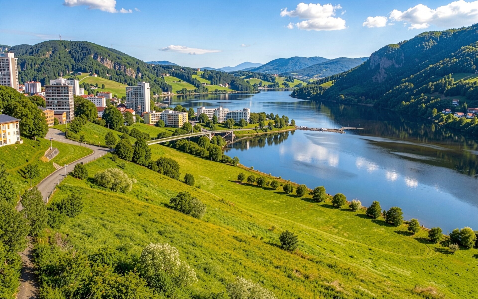Скачайте с нашего сайта обои Городской пейзаж с озером в зеленых горах в формате JPG, так как здесь нет полос градиента из-за низкого битрейта.