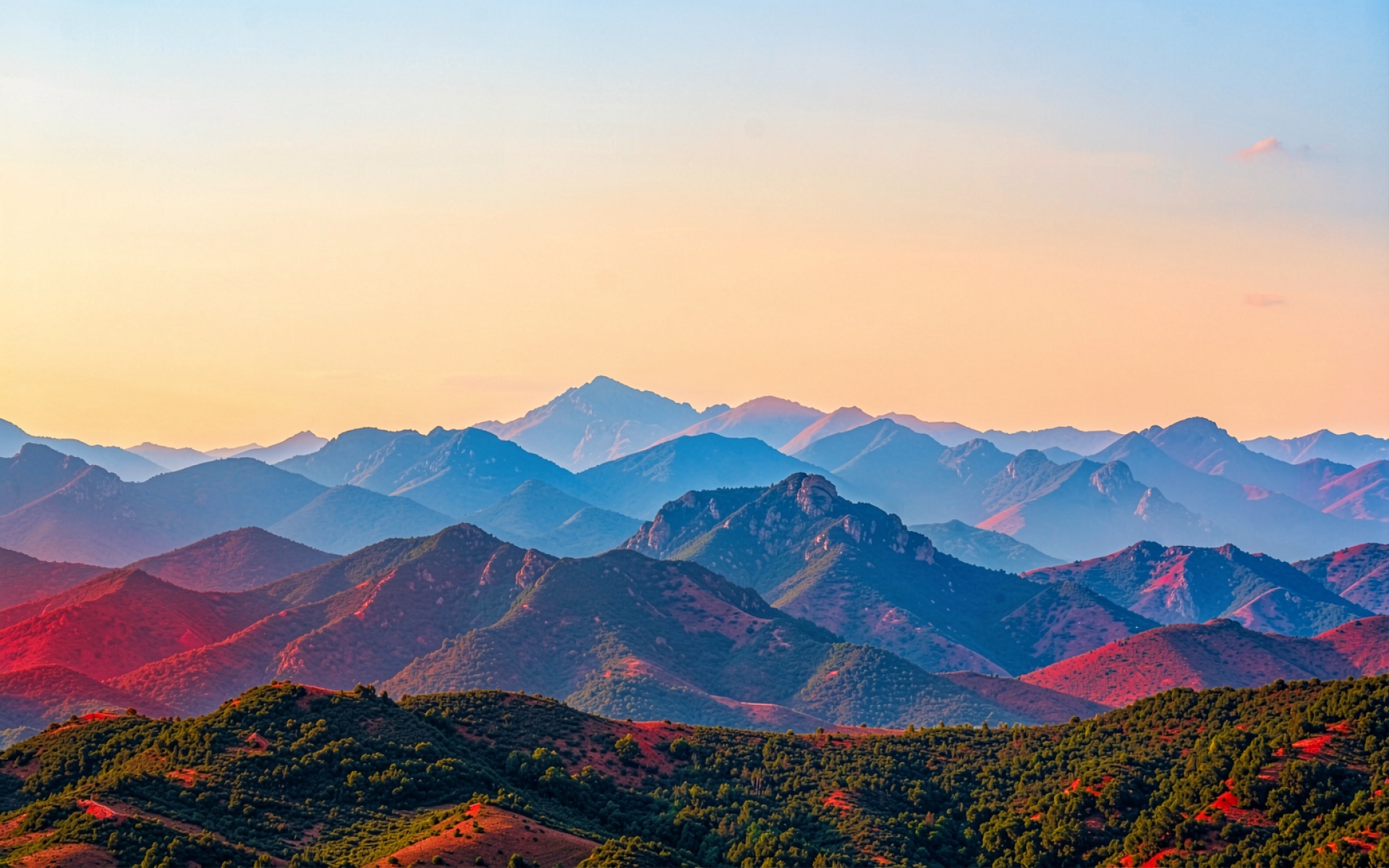 Изображение характеризуется глубоким контрастом между теплыми красными оттенками переднего плана и холодным синим градиентом дальних хребтов. Текстуры скал переданы четко, с акцентом на игру света и тени в складках рельефа. Мягкое освещение неба создает плавный переход от золотистого к бледно-голубому, что подчеркивает объем каждой вершины. Перед загрузкой доступен удобный предпросмотр для оценки качества отображения на вашем экране.