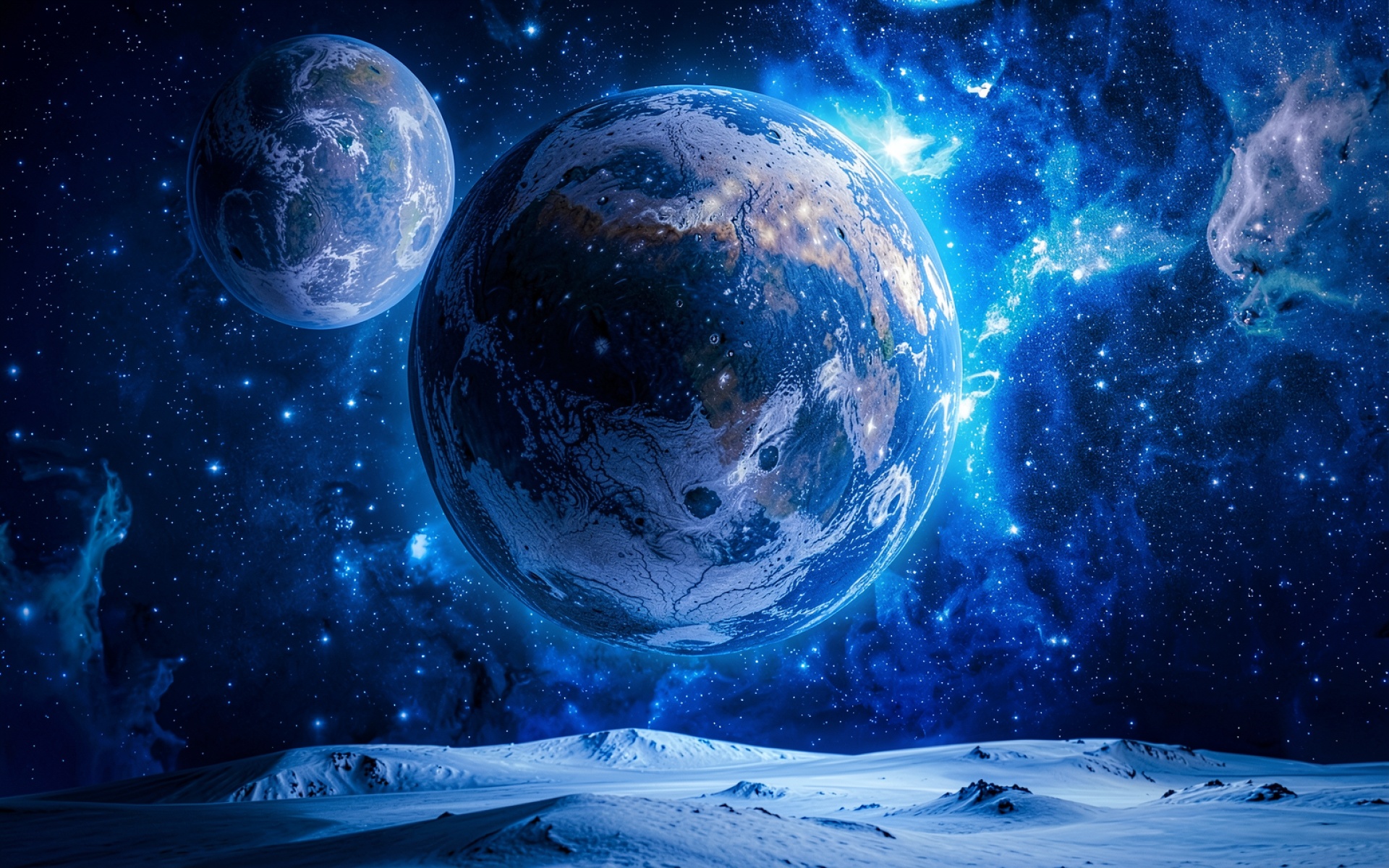 Изображение демонстрирует детальную текстуру замерзших поверхностей с выраженным рельефом кратеров и ледяных щитов. Освещение создает резкий контраст между яркими бликами на горизонте планет и глубокими тенями в их полушариях. Фон характеризуется плавными градиентами темно-синего цвета с вкраплениями звездной пыли и туманностей. На сайте доступен удобный предпросмотр перед скачиванием для оценки качества на экране.