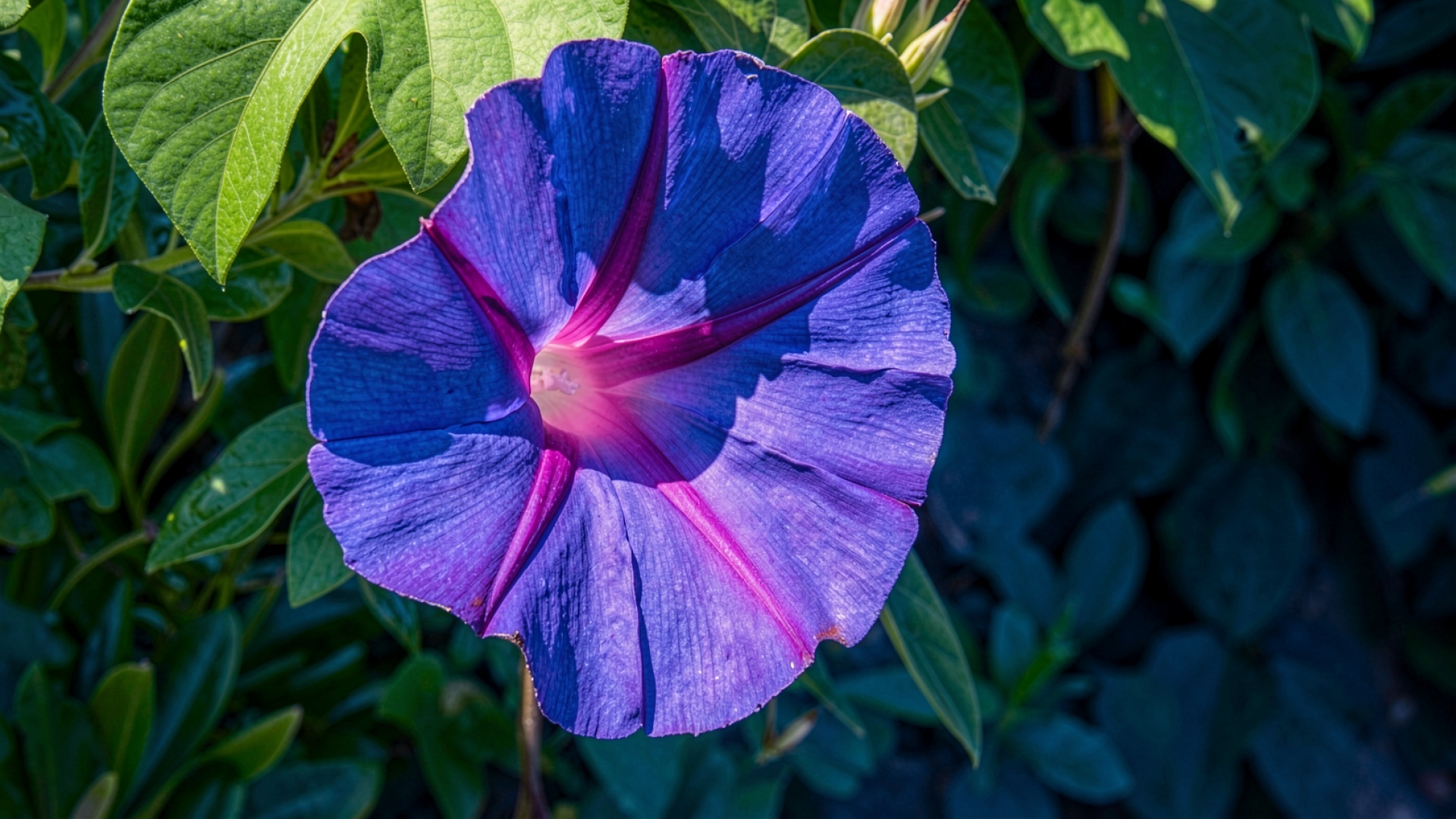 Данные обои демонстрируют детальную текстуру лепестков с выраженными радиальными прожилками. Освещение создает мягкие переходы от глубокого синего к яркому пурпурному в центре цветка. Контрастные тени подчеркивают объем чашечки, а градиенты фона плавно уводят взгляд от насыщенного объекта к приглушенной зелени листвы. На сайте доступен удобный предпросмотр перед загрузкой для оценки качества на вашем экране.
