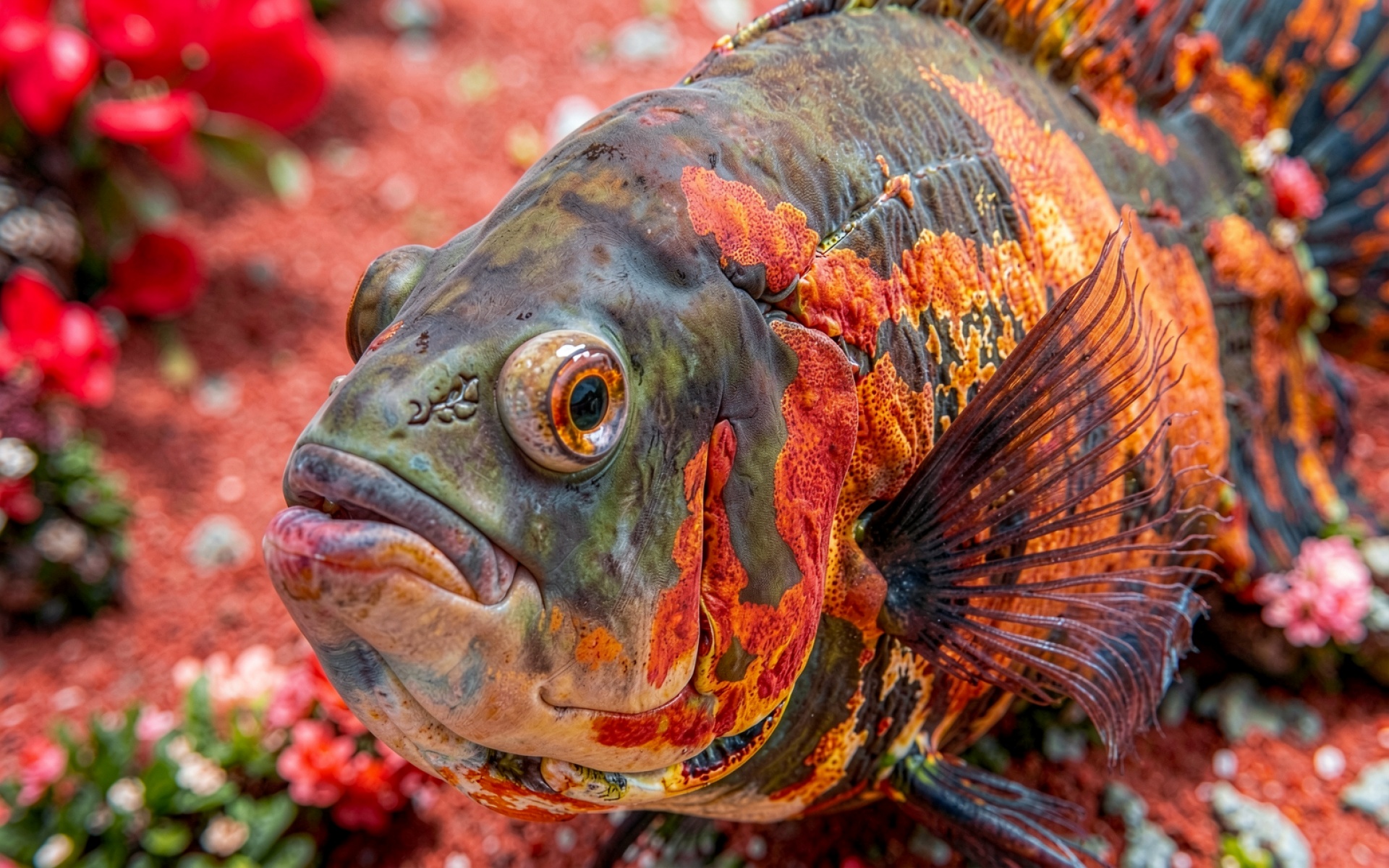 Изображение детально передает чешуйчатую текстуру кожи рыбы и тонкие линии плавников. Контрастное освещение подчеркивает переходы между серыми и ярко-оранжевыми участками тела, создавая глубокие тени в складках жаберных крышек. Фон с красным градиентом песка дополняет общую композицию, а мягкие блики на глазах добавляют объема. На сайте доступен удобный предпросмотр перед загрузкой для оценки качества на экране.