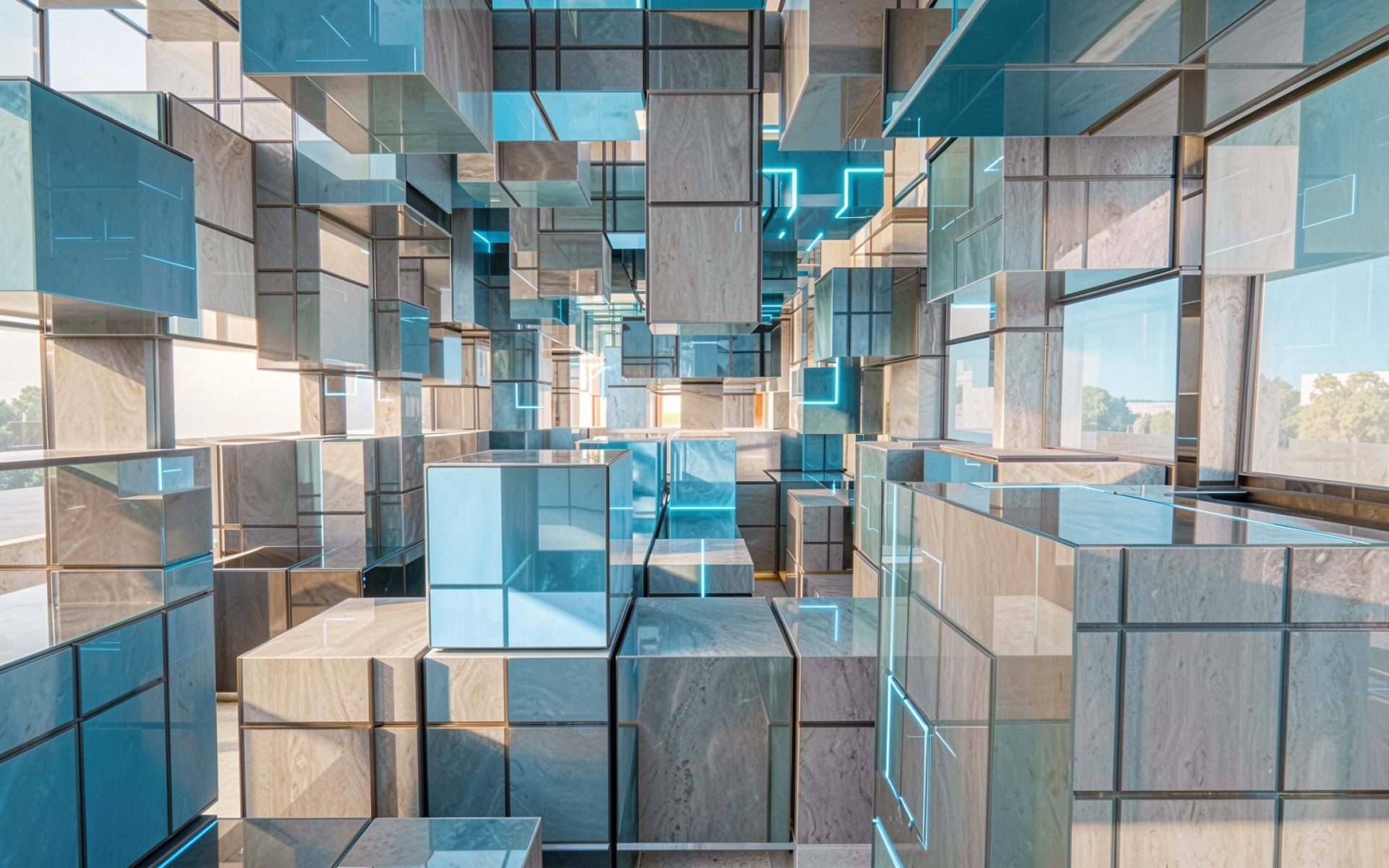 Абстрактные стеклянные кубы в светлом футуристическом интерьере обои
