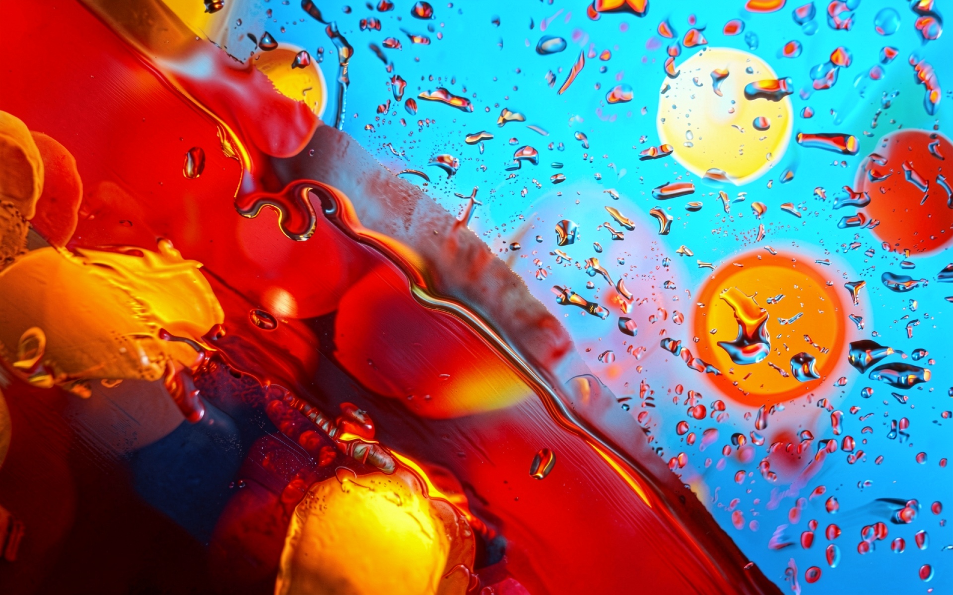 Скачайте это изображение в высоком разрешении для обновления рабочего стола, так как контраст насыщенных цветов и четкая детализация создают глубокий визуальный акцент. Снимок представляет собой результат макрофотографии, где взаимодействие гидрофобных жидкостей формирует идеальные сферы и органические линии.