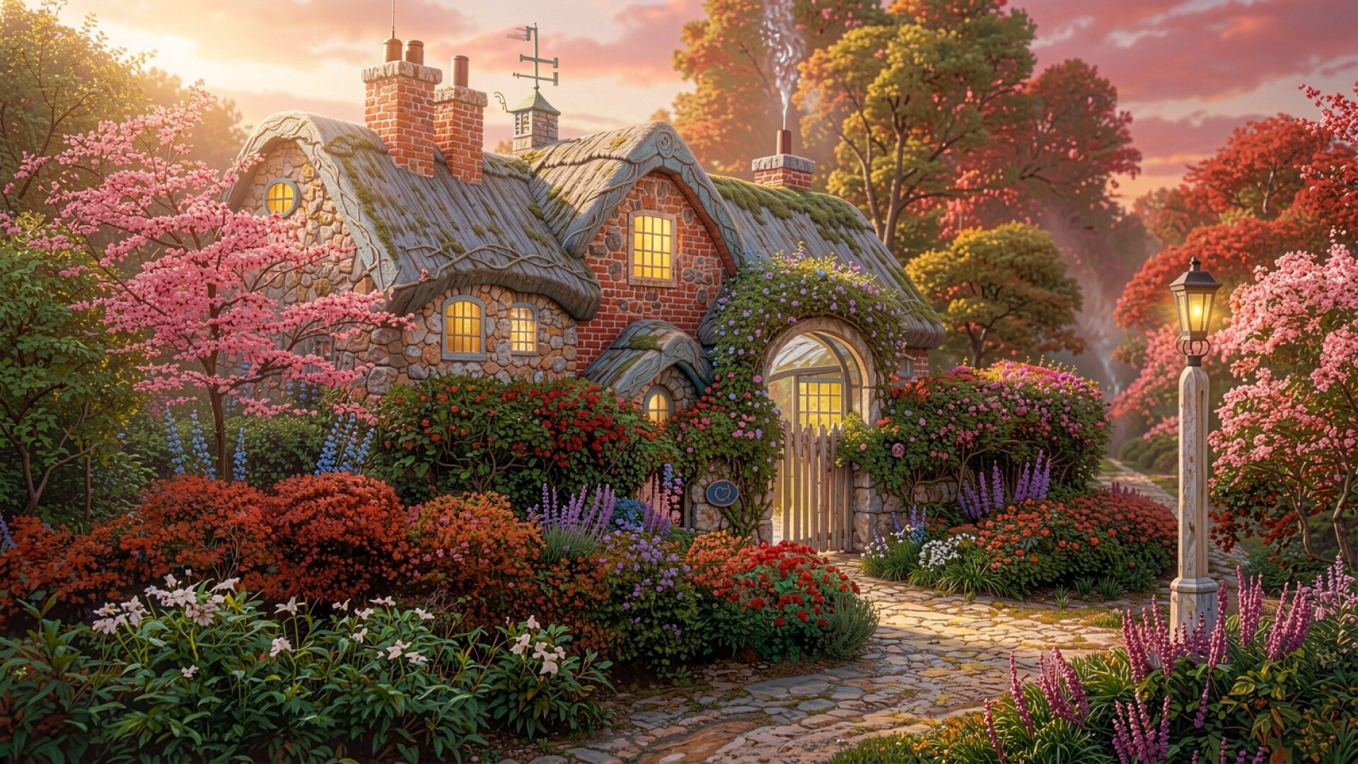 Изображение детально передает текстуру грубого камня стен и переплетения сухой травы на кровле. Мягкий свет заката создает теплые блики в окнах и глубокие тени в густых зарослях роз. Градиенты неба плавно переходят от золотистого к розовому, подчеркивая объем садовых растений и каменной дорожки. На сайте доступен удобный предпросмотр перед скачиванием для оценки качества на экране.