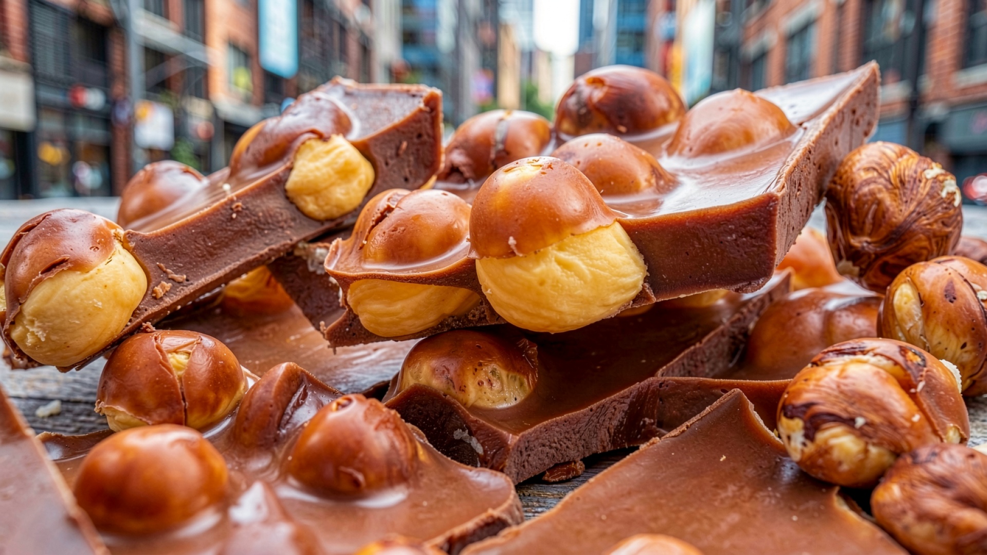 Техническое исполнение кадра подчеркивает глянцевую текстуру поверхности плитки и пористую структуру разломов шоколада. Освещение создает мягкие блики на округлых формах орехов, а глубокие тени в местах пересечения фрагментов добавляют объему реалистичности. Градиенты фона плавно уводят взгляд от четких передних планов к размытому городскому пейзажу. Сайт предоставляет удобный предпросмотр перед загрузкой для оценки качества на вашем экране.