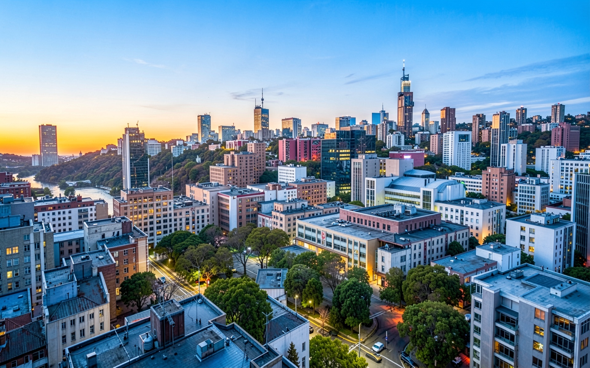 Изображение детально передает архитектурный облик городских кварталов с акцентом на геометрию зданий и текстуру бетона. Освещение характеризуется мягким градиентом от глубокого синего в зените до теплого оранжевого у горизонта, что создает выразительные блики на стеклянных фасадах небоскребов. Контрастные тени подчеркивают объем городской застройки и плотность зеленых насаждений между домами. Перед загрузкой доступен удобный предпросмотр для оценки качества отображения всех элементов сцены на экране.
