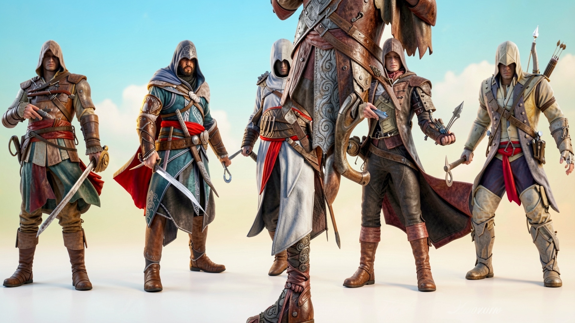 Изображение детально передает текстуру плотной ткани, кожаных ремней и металлических элементов скрытых клинков. Освещение распределено равномерно, создавая мягкие переходы между светлыми участками одежд и глубокими тенями в складках костюмов. Фон выполнен в виде чистого градиента от светло-голубого к белому, что акцентирует внимание на контрастных деталях экипировки персонажей. На сайте доступен удобный предпросмотр перед скачиванием для оценки качества на экране.