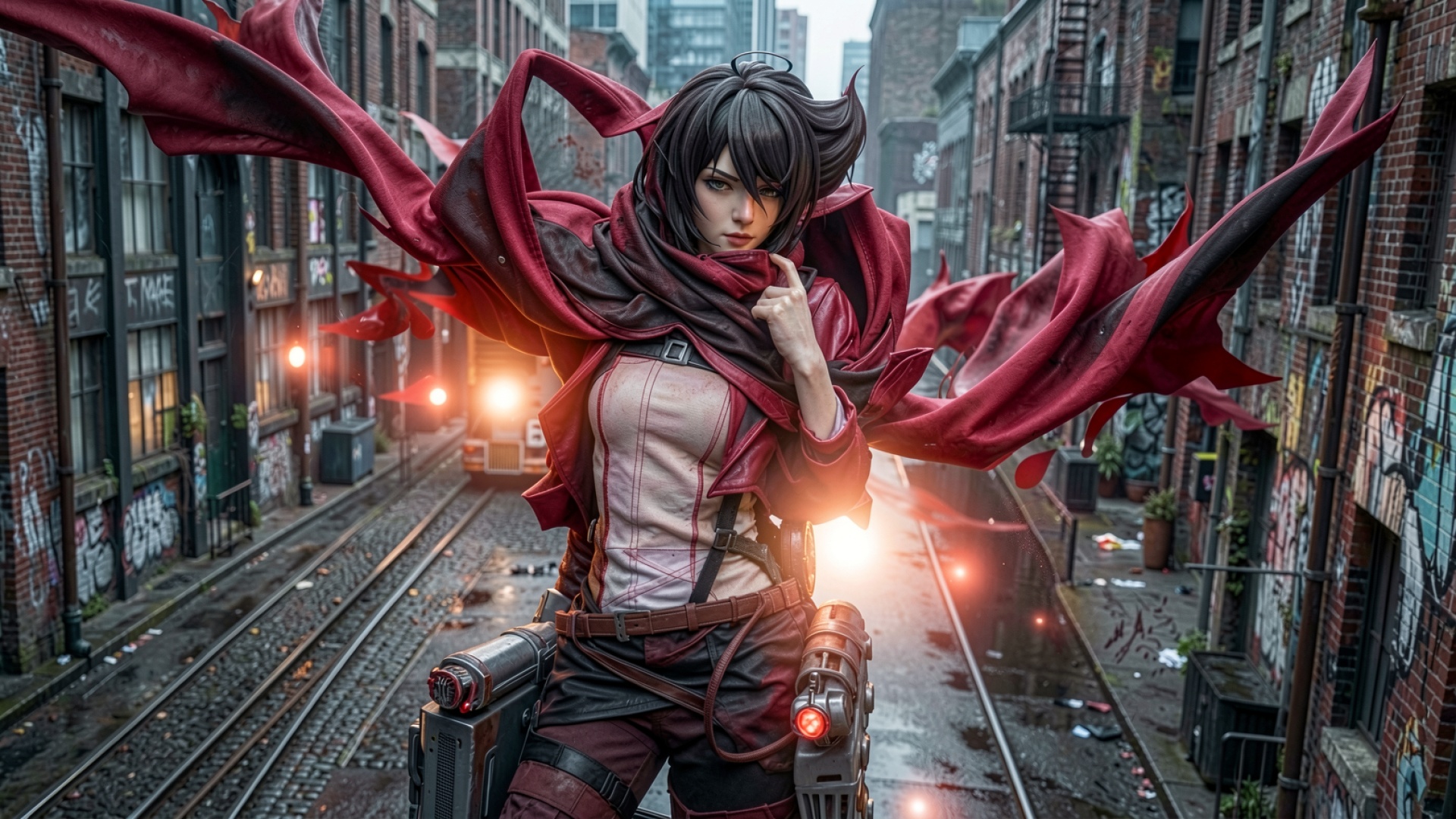 Изображение детально передает текстуру плотной ткани плаща и матовую поверхность тактического снаряжения. Освещение имитирует контровой свет от городских фонарей, создавая четкие блики на волосах и глубокие тени в складках одежды. Фон с кирпичными стенами и рельсами имеет плавный переход в дымку, что подчеркивает объем центральной фигуры. На сайте доступен удобный предпросмотр перед скачиванием для оценки качества на экране.