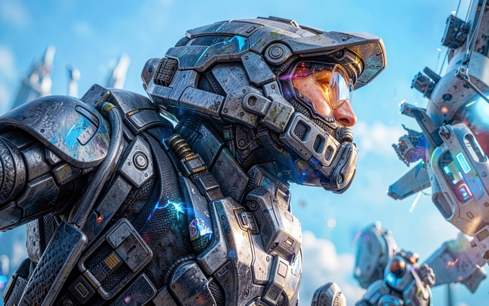Изображение детально передает текстуру потертого металла, матовые поверхности шлема и глянцевые блики на визоре. Освещение имитирует яркий дневной свет, создавая четкие контрастные тени в сочленениях брони и мягкие градиенты голубого неба на заднем плане. На сайте доступен удобный предпросмотр перед загрузкой для оценки качества отображения на экране.