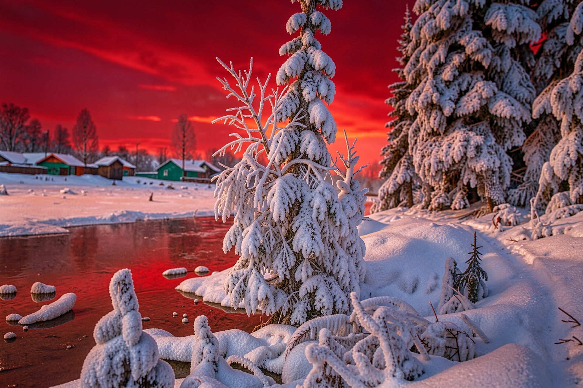 Композиция построена на противопоставлении холодных белых тонов свежевыпавшего снега и глубокого красного градиента вечернего неба. В центре внимания находится ель, покрытая плотным слоем инея, что создает выраженную текстуру поверхности. Освещение имитирует эффект золотого часа, когда низкое солнце подчеркивает объем каждой ветви и отражается в зеркальной глади незамерзшего ручья. Согласно данным сайта nationalgeographic.com, подобные природные явления связаны с определенным углом преломления света в атмосфере при низких температурах. Технически изображение характеризуется высокой детализацией мелких фракций снега и плавными переходами цветовых зон без цифрового шума.