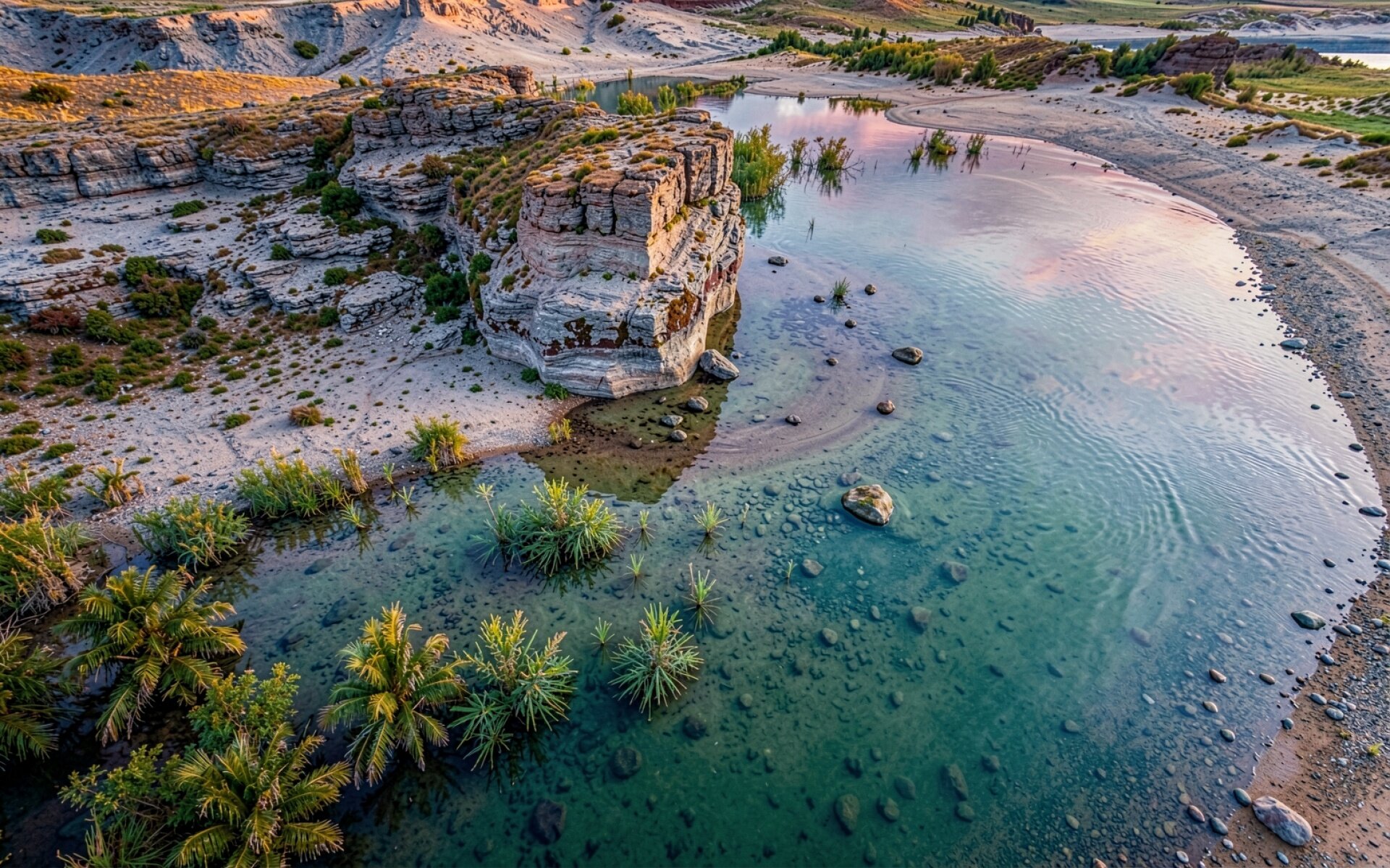 Скалистый утес у бирюзового озера в пустыне обои