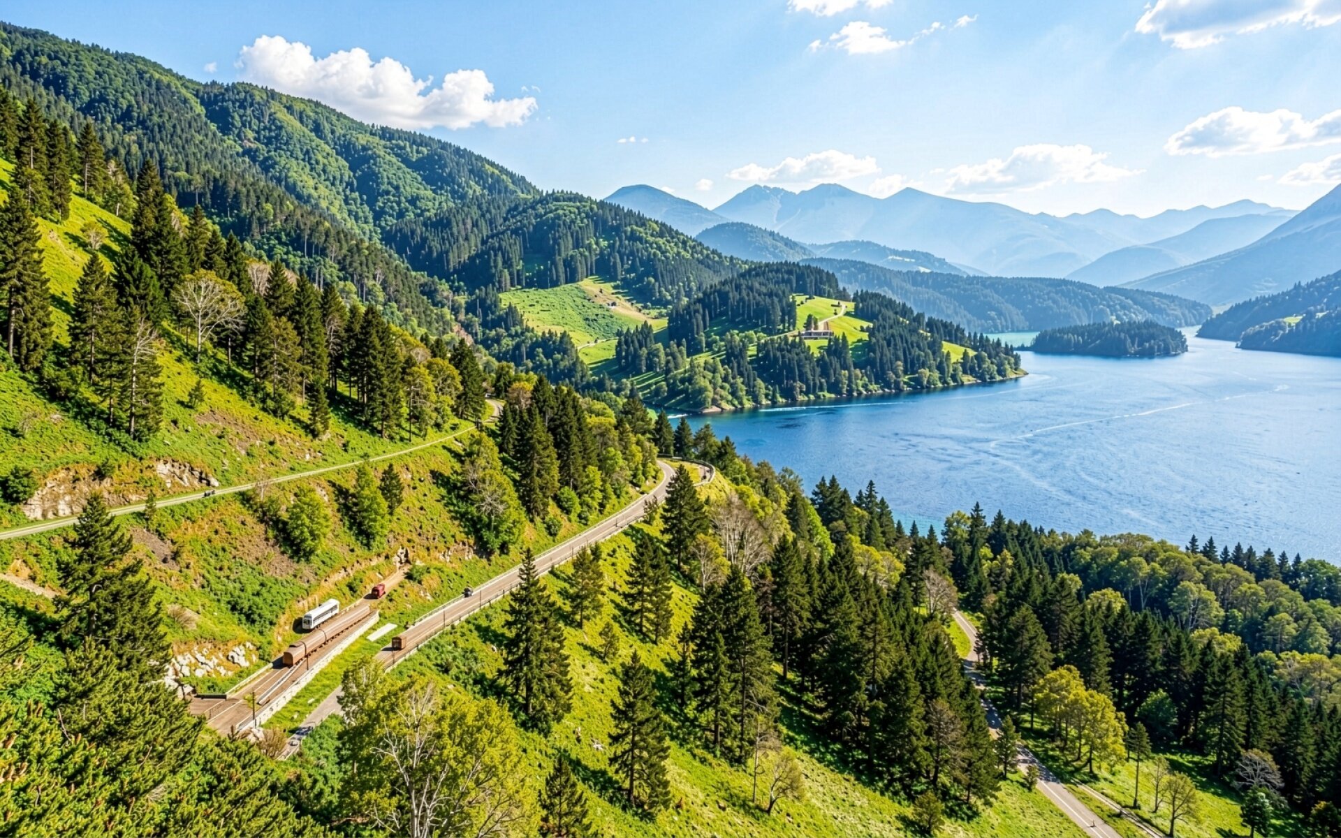 Техническое исполнение кадра подчеркивает контраст между органическими формами хвойного леса и линейной структурой путей. Освещение имитирует яркий дневной свет, создавая четкие тени в складках гор и выраженные блики на водной глади. Градиенты синего цвета в небе плавно переходят в глубокие оттенки лазури озера, а текстура растительности передана через детальную проработку каждой группы деревьев. На сайте предусмотрен удобный предпросмотр перед скачиванием для оценки качества на вашем экране.