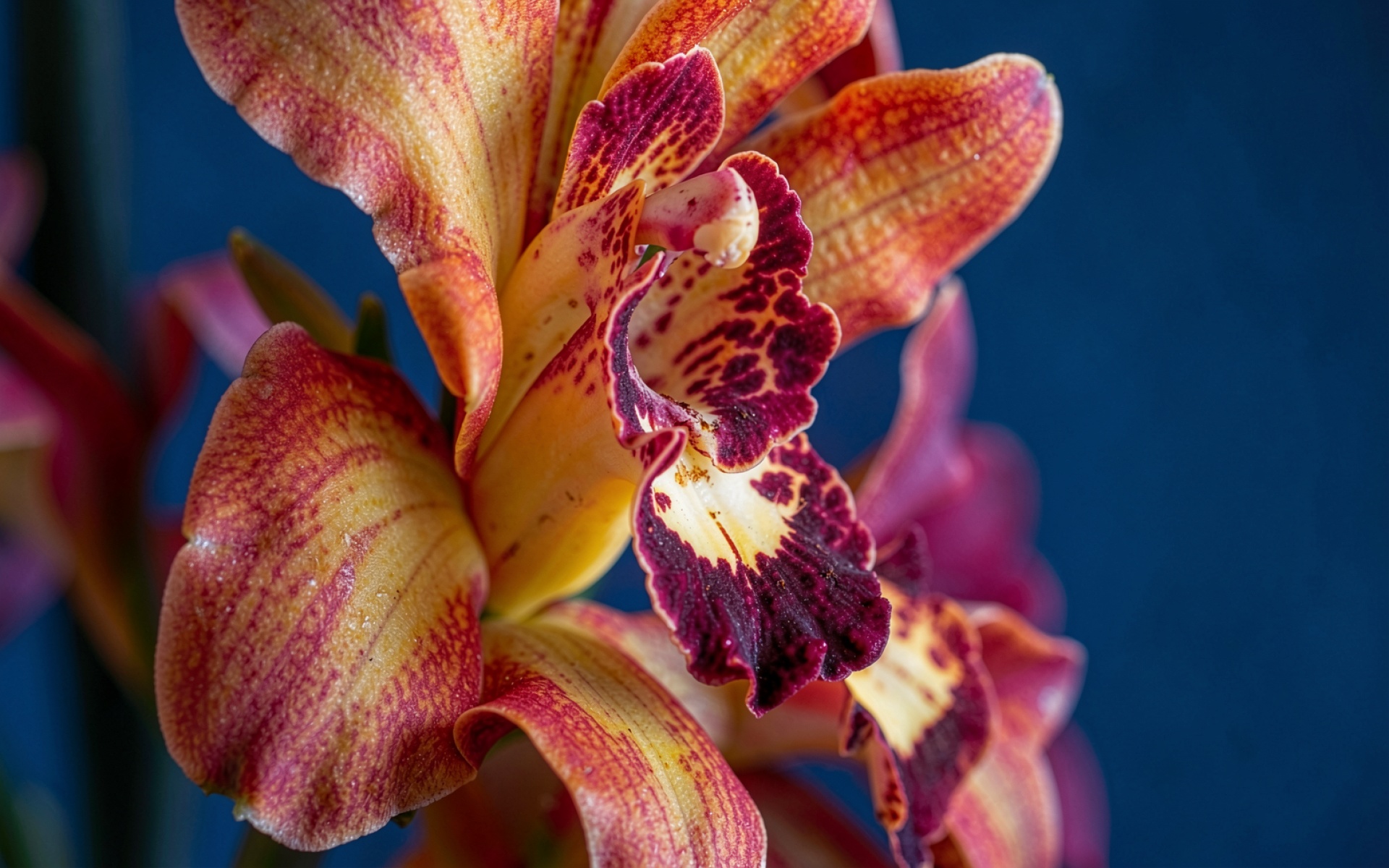 Скачайте с нашего сайта обои Цветок орхидеи желто-красный на синем фоне в формате JPG, так как только здесь представлена оригинальная компрессия с минимальными потерями.
