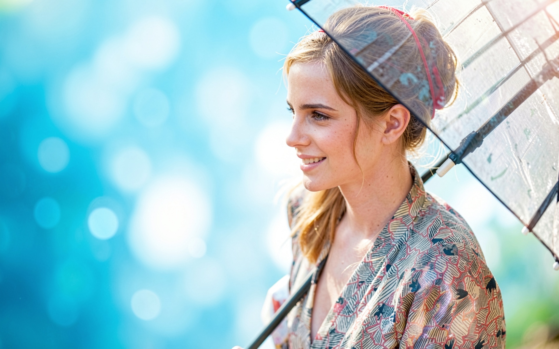 Изображение отличается детальной проработкой текстуры ткани кимоно и тонким переходом световых бликов на лице модели. Мягкое естественное освещение создает плавные тени, а задний план с эффектом боке формирует глубокий градиент синих и голубых тонов. Контраст между четкими линиями зонта и размытым фоном подчеркивает объем композиции. На сайте доступен удобный предпросмотр перед скачиванием для оценки качества на вашем экране.