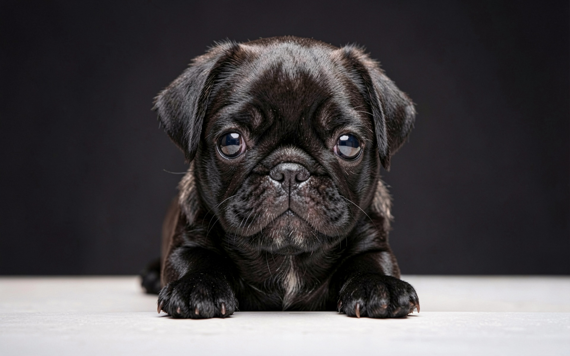 Черный щенок мопса на темном фоне обои