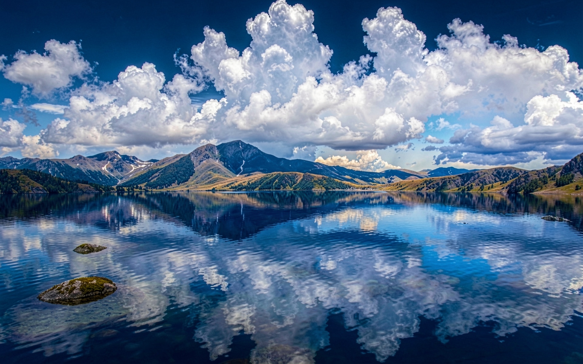 Горное озеро синее небо белые облака обои