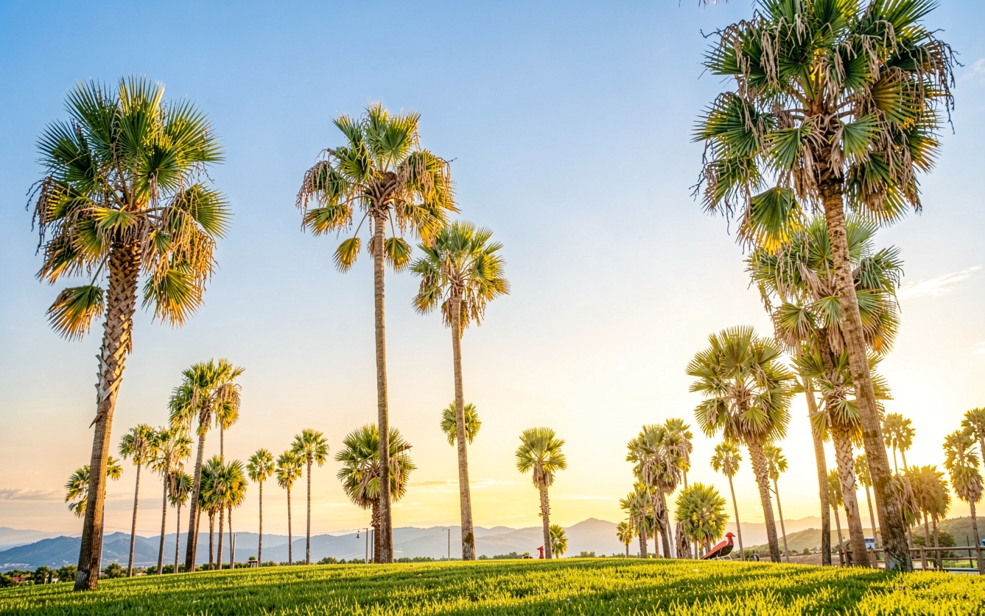 Изображение детально передает текстуру коры стволов и веерную форму листьев. Мягкий свет заходящего солнца создает теплые блики на кронах и глубокие тени в нижней части травы. Плавный градиент неба от голубого к золотистому подчеркивает силуэты деревьев. На сайте доступен удобный предпросмотр перед скачиванием, чтобы оценить качество отображения на экране.