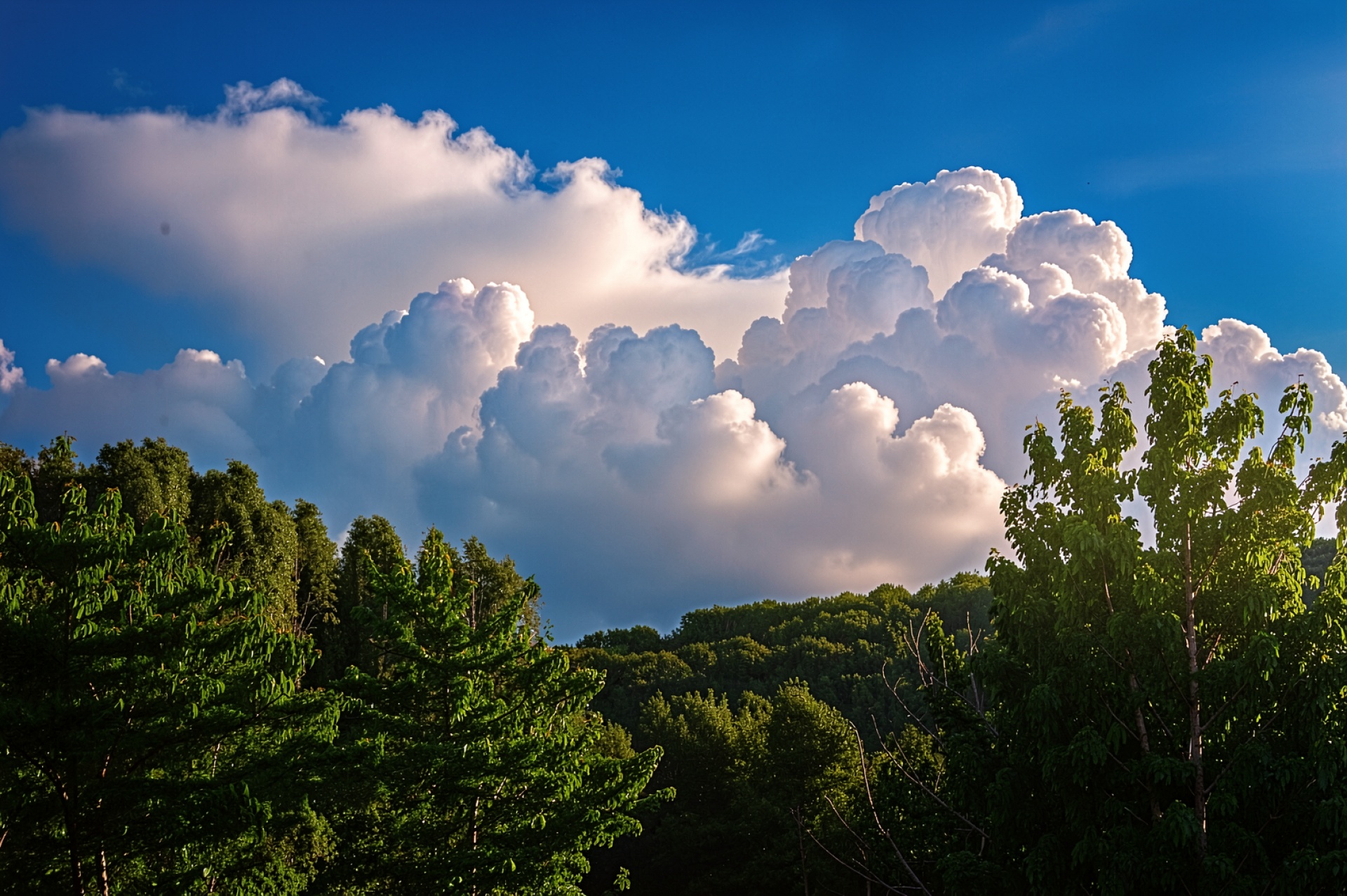 Изображение характеризуется высокой детализацией текстур ватных облачных массивов и плотной листвой деревьев. Освещение создает выраженные контрасты между ярко освещенными вершинами кучевых облаков и глубокими тенями в лесной зоне. Градиенты синего неба плавно переходят от насыщенного лазурного к светлому горизонту, что подчеркивает объем атмосферных образований. На сайте предусмотрен удобный предпросмотр перед загрузкой для оценки качества на экране.