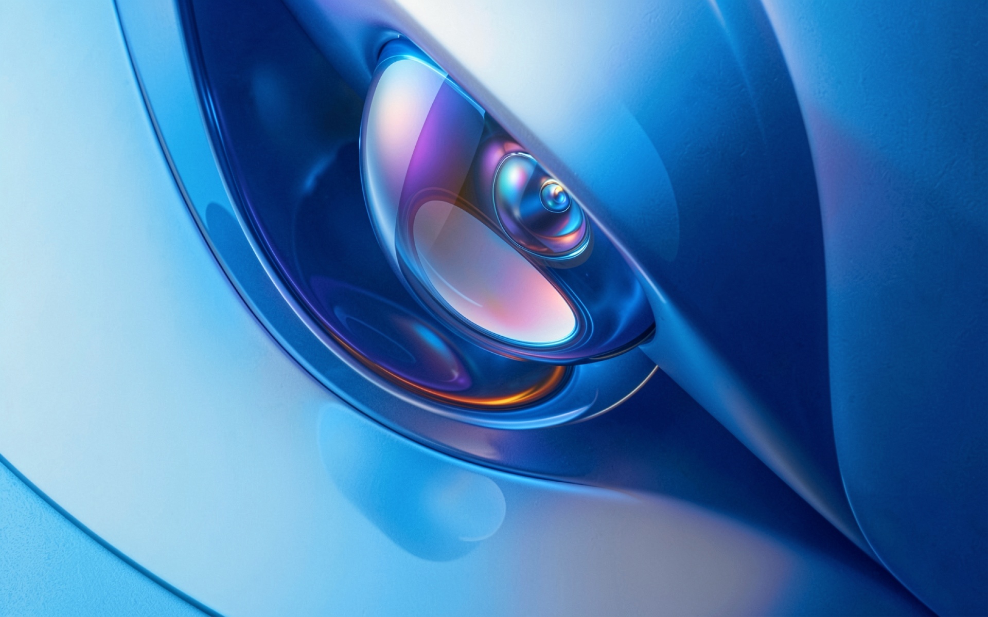 Изображение характеризуется сложной игрой света на глянцевых поверхностях. Центральный объект обладает многослойной структурой с выраженными радужными бликами и мягкими градиентами синего цвета. Контрастные тени подчеркивают объем криволинейных форм, а плавные переходы освещения создают эффект глубины пространства. На сайте доступен удобный предпросмотр перед загрузкой для оценки качества на экране.