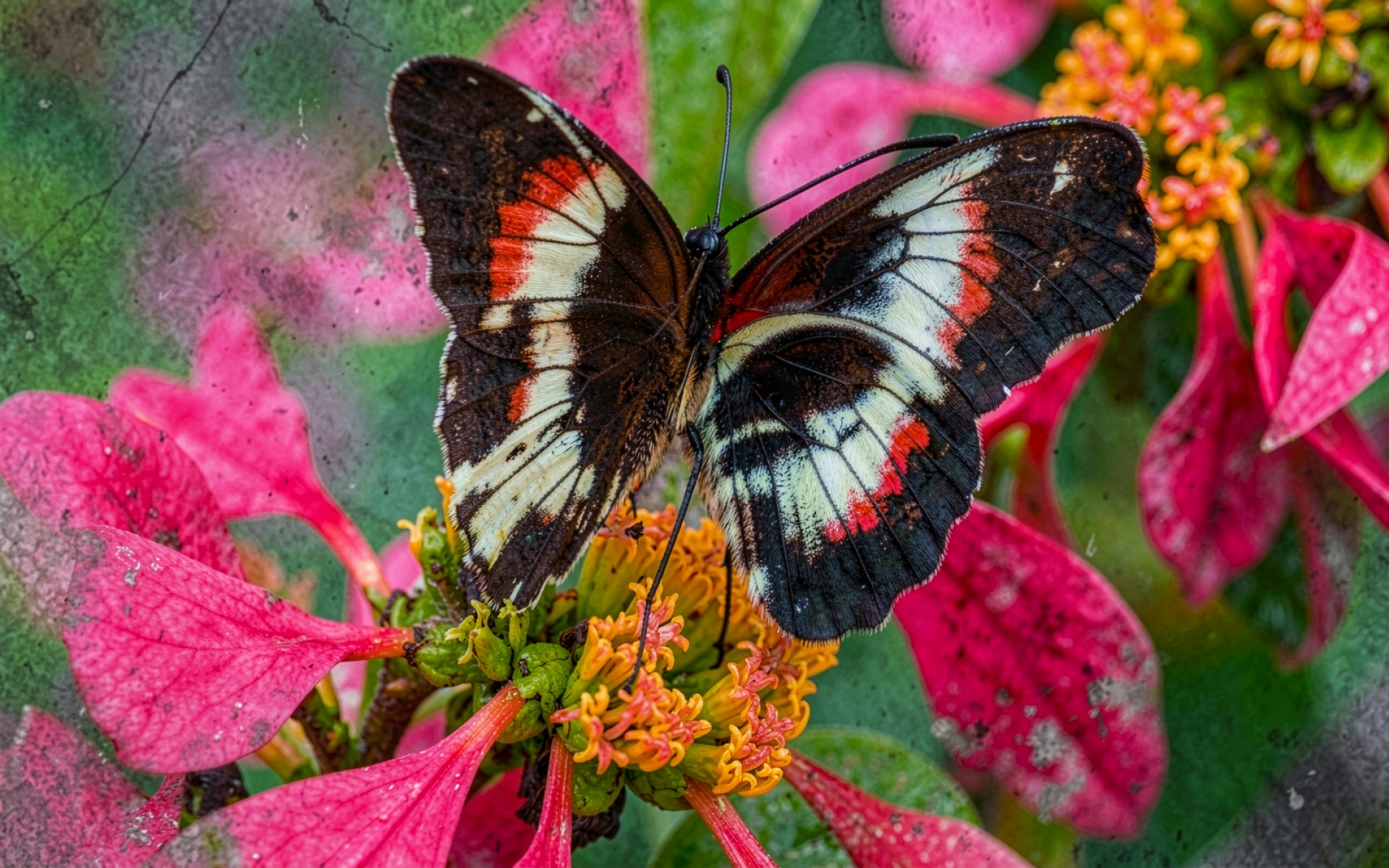 На снимке запечатлена бабочка с характерным контрастным рисунком: черные края сочетаются с белыми вставками и ярко-оранжевыми акцентами. Глубина резкости настроена так, что фокус сосредоточен на деталях чешуек крыльев и строении усиков. Цветок имеет насыщенный малиновый оттенок с желтыми элементами сердцевины, что создает естественный цветовой контраст. Согласно данным nationalgeographic.com, макрофотография позволяет изучить морфологию насекомых, недоступную человеческому глазу при обычном наблюдении. Технически изображение характеризуется правильным балансом белого и отсутствием цифрового шума в тенях.