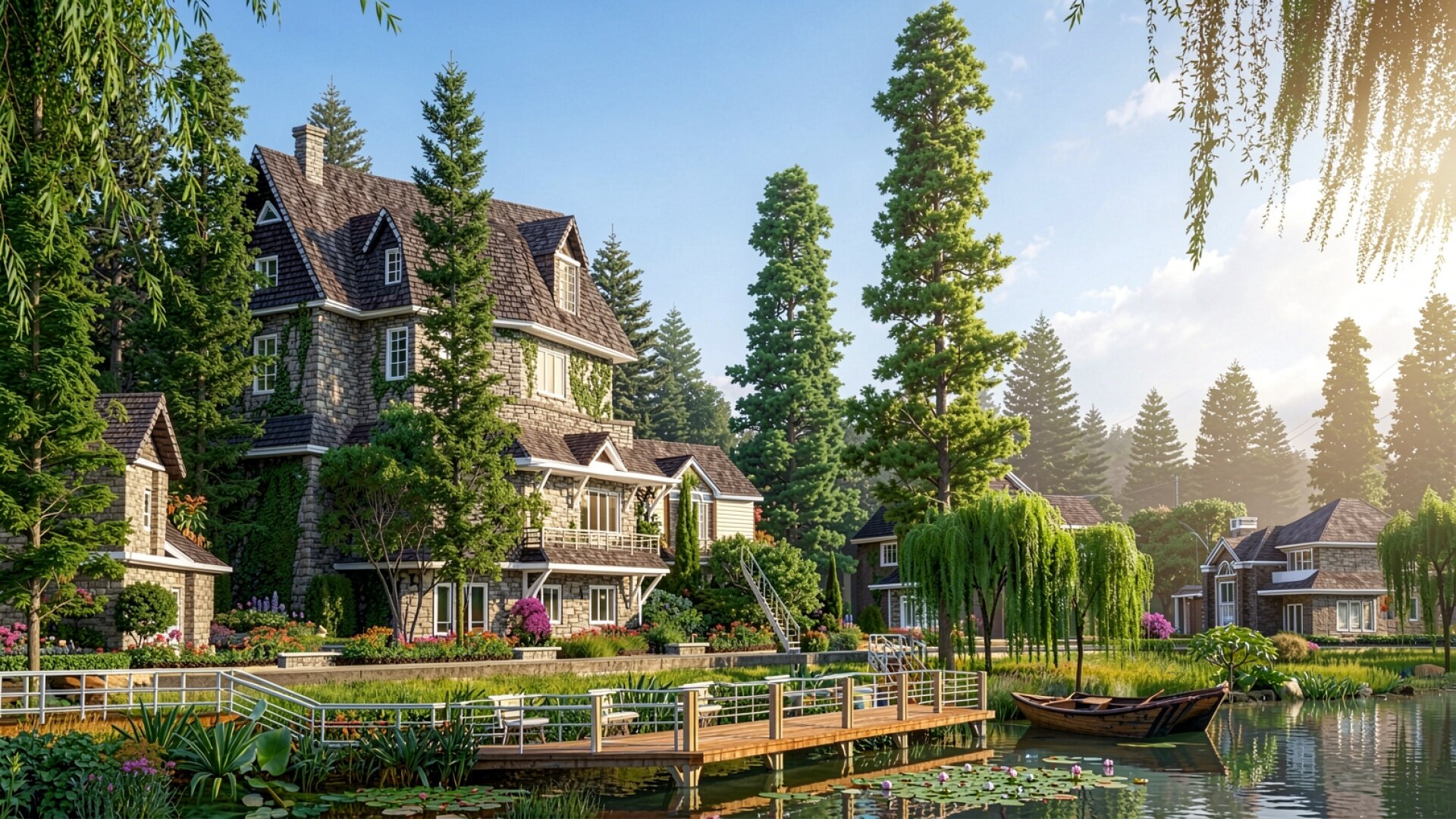 Изображение детально передает шероховатую текстуру природного камня и переплетения плюща на стенах здания. Мягкое естественное освещение создает плавные градиенты в небе и глубокие тени под навесами крыши, подчеркивая объем архитектурных форм. Контраст между темной черепицей и яркой зеленью листвы дополняется бликами на поверхности воды у причала. На сайте доступен удобный предпросмотр перед скачиванием для оценки качества отображения всех элементов сцены на вашем экране.
