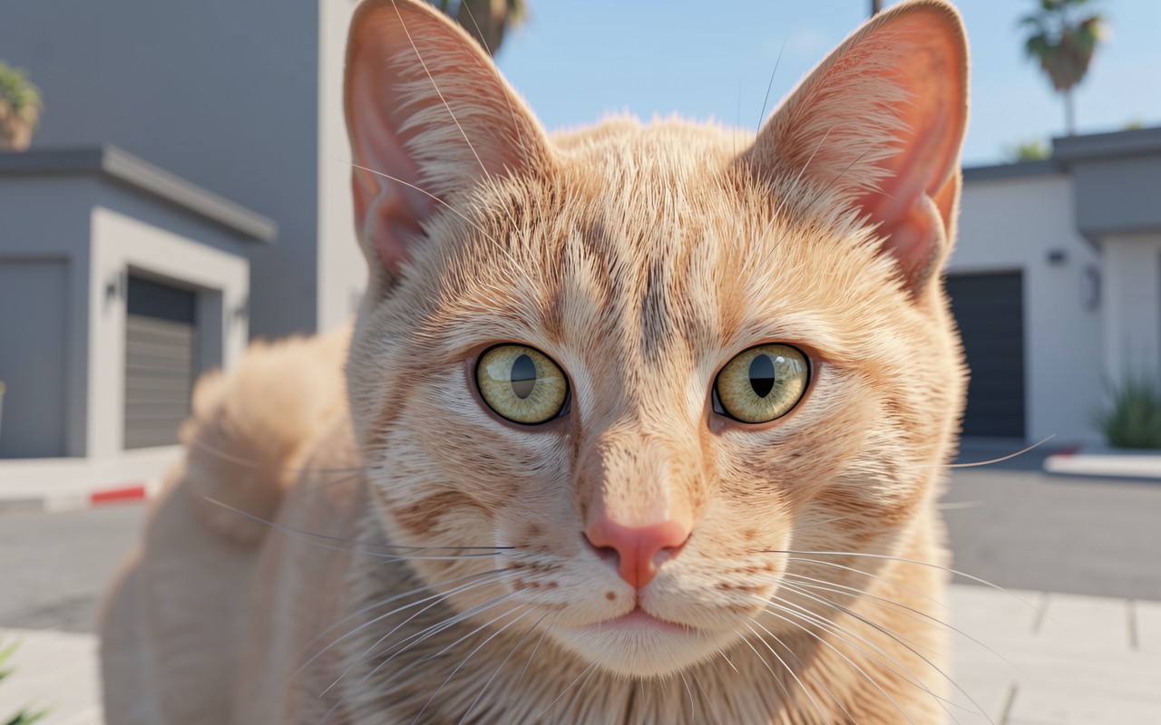 Изображение детально передает текстуру шерсти с четким разделением рыжих и кремовых оттенков. Освещение имитирует яркий дневной свет, создавая мягкие блики на поверхности глаз и глубокие тени в области ушей. Фон характеризуется плавными градиентами серого цвета стен и минималистичными архитектурными линиями. На сайте доступен удобный предпросмотр перед скачиванием для оценки качества на экране.