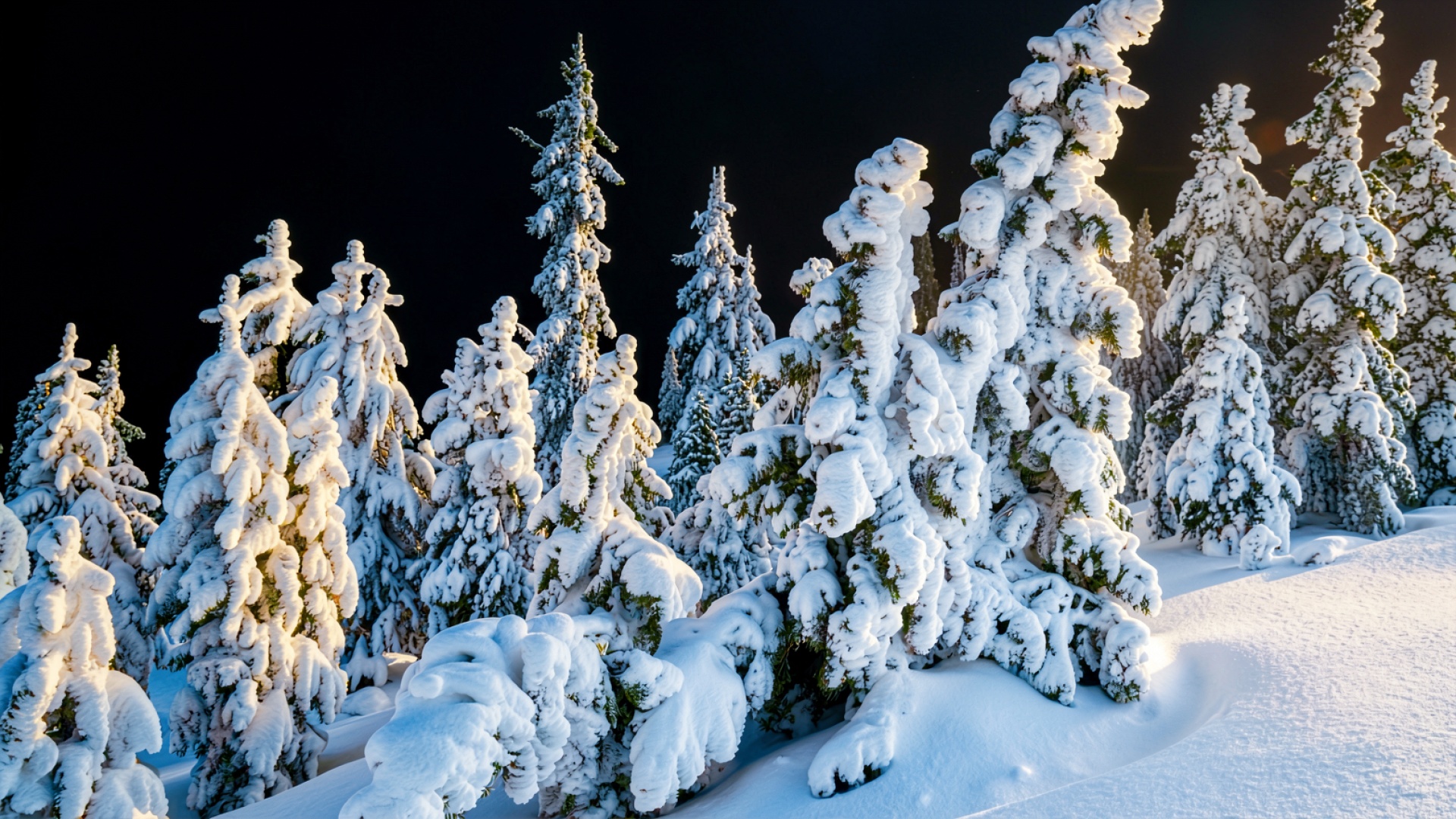 Изображение детально передает текстуру свежевыпавшего снега на ветвях хвойных деревьев. Контрастное освещение создает четкие блики на белых поверхностях и глубокие тени в гуще леса. Градиент темного фона подчеркивает силуэты деревьев, создавая объемную композицию. На сайте доступен удобный предпросмотр перед загрузкой для оценки качества отображения на экране.