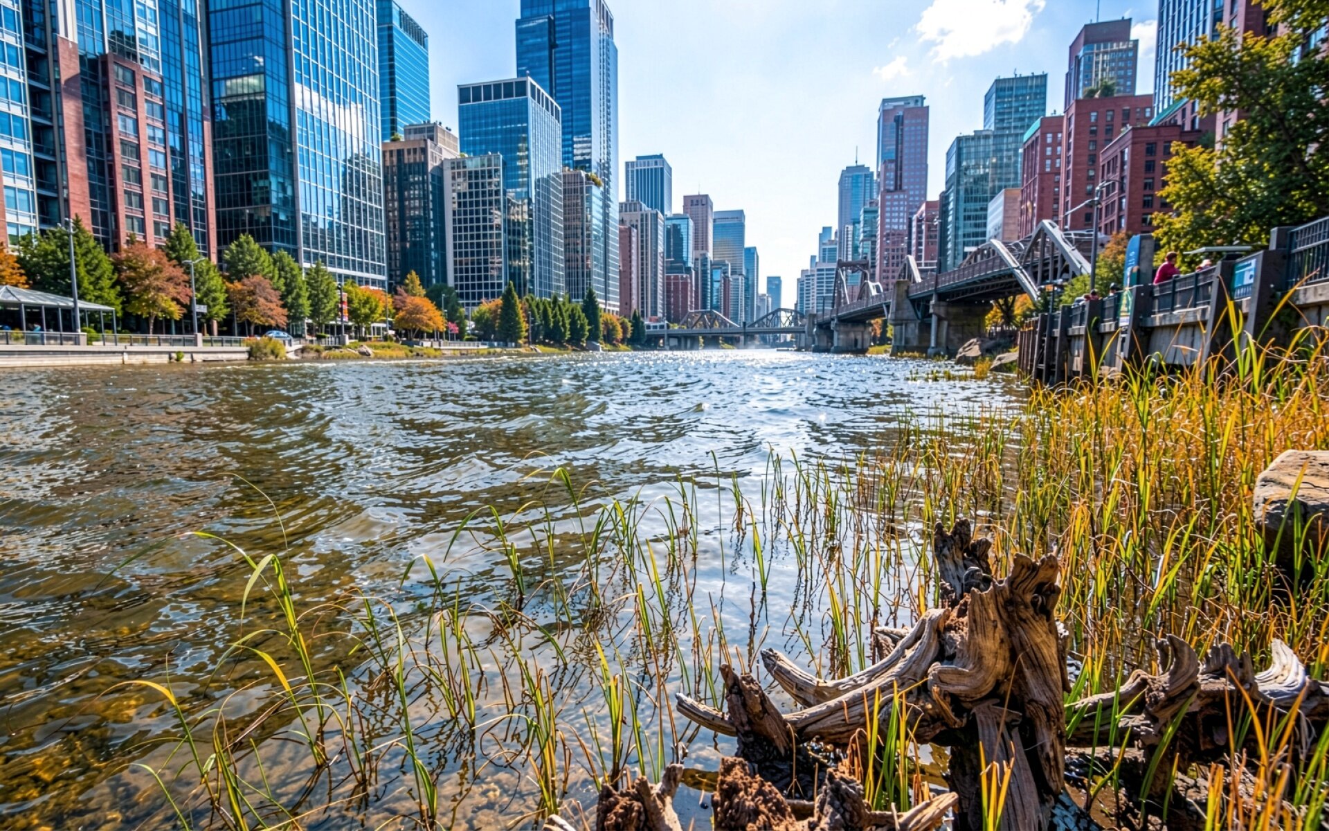 Изображение детально передает отражения стеклянных фасадов в водной глади, создавая сложную игру света и тени. Текстура коряги на переднем плане контрастирует с гладкими поверхностями современных зданий, а градиенты голубого неба плавно переходят в глубокие оттенки городского пейзажа. На сайте доступен удобный предпросмотр перед загрузкой для оценки качества на экране.