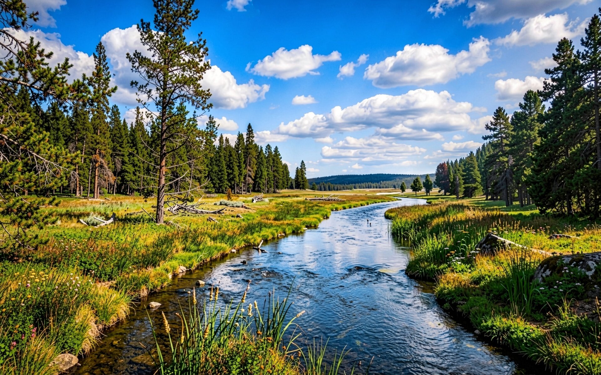Изображение детально передает текстуру водной глади с четкими бликами на поверхности потока. Освещение имитирует яркий солнечный день, создавая контрастные переходы между насыщенной зеленью прибрежной травы и глубокими тенями под кронами хвойных деревьев. Градиент синего неба плавно переходит к белоснежным кучевым облакам, что дополняет общую композицию. На сайте доступен удобный предпросмотр перед скачиванием для оценки качества на экране.