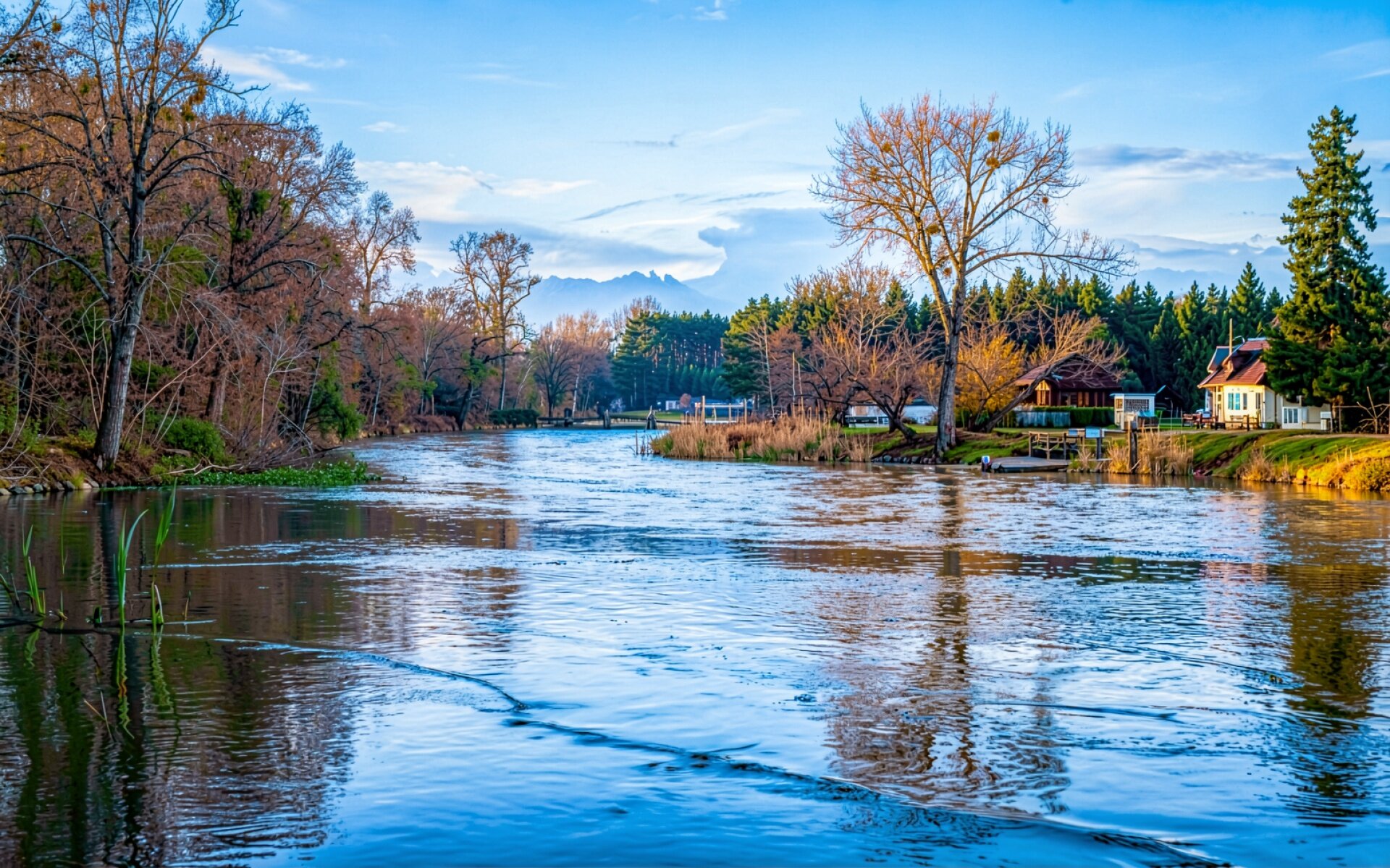 Изображение характеризуется детальной проработкой текстуры коры деревьев и мягкими градиентами закатного неба. Освещение создает выраженные блики на водной глади, где отражения домов и лесного массива переданы с высокой точностью теней. Контраст между золотистой листвой и глубоким синим цветом воды подчеркивает объем сцены. На сайте доступен удобный предпросмотр перед скачиванием для оценки качества на экране.