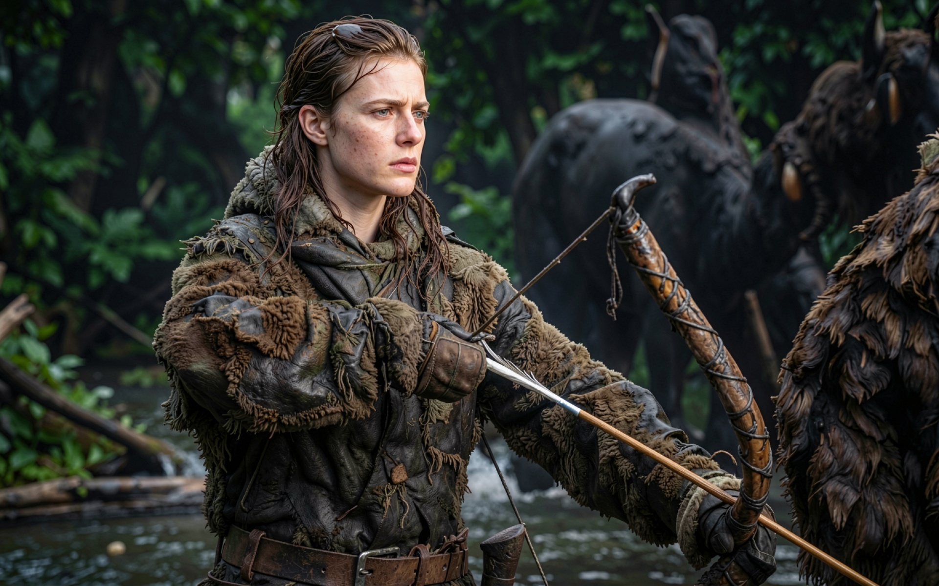 Изображение детально передает текстуру грубой ткани и кожи, покрытых слоями засохшей грязи. Освещение рассеянное, характерное для густого леса, что создает мягкие переходы теней на лице героики и подчеркивает влажный блеск волос. Фон с глубокими зелеными градиентами отделяет фигуру от окружающей среды, акцентируя внимание на деталях лука из темного дерева. На сайте доступен удобный предпросмотр перед загрузкой для оценки качества отображения на вашем экране.