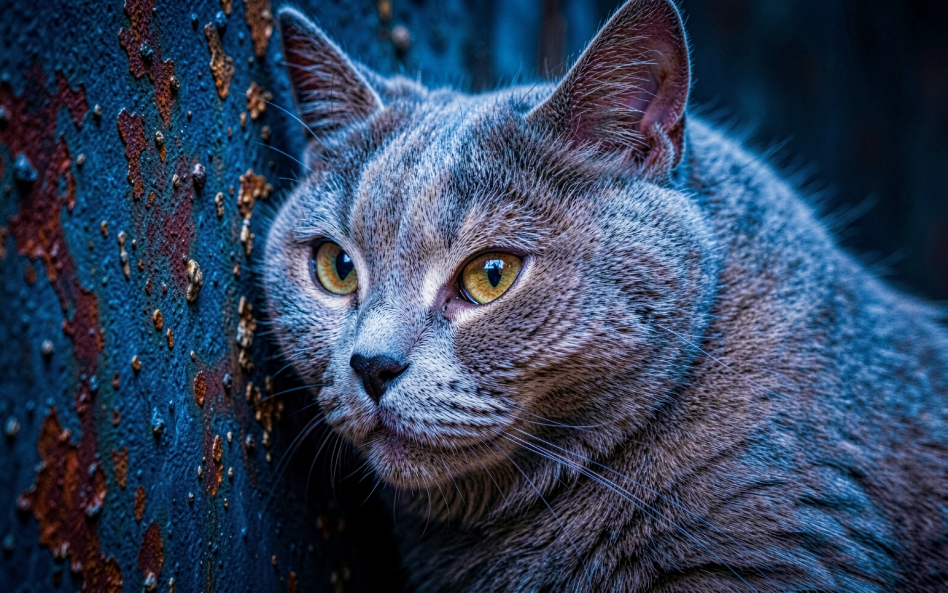 Изображение детально передает текстуру короткой шерсти животного и грубую поверхность окисленного металла. Контраст между холодным синим фоном и рыжими пятнами ржавчины создает глубокий визуальный объем. Освещение подчеркивает блики в желтых глазах кота и мягкие переходы теней на морде. Перед загрузкой доступен удобный предпросмотр, чтобы оценить качество цветопередачи на вашем экране.