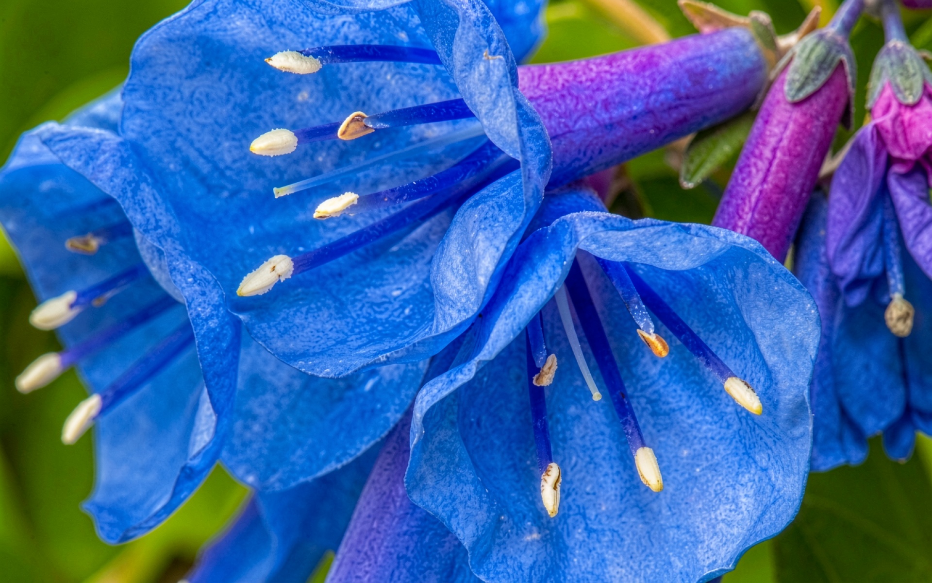 Синие колокольчики в макросъемке на зеленом фоне обои