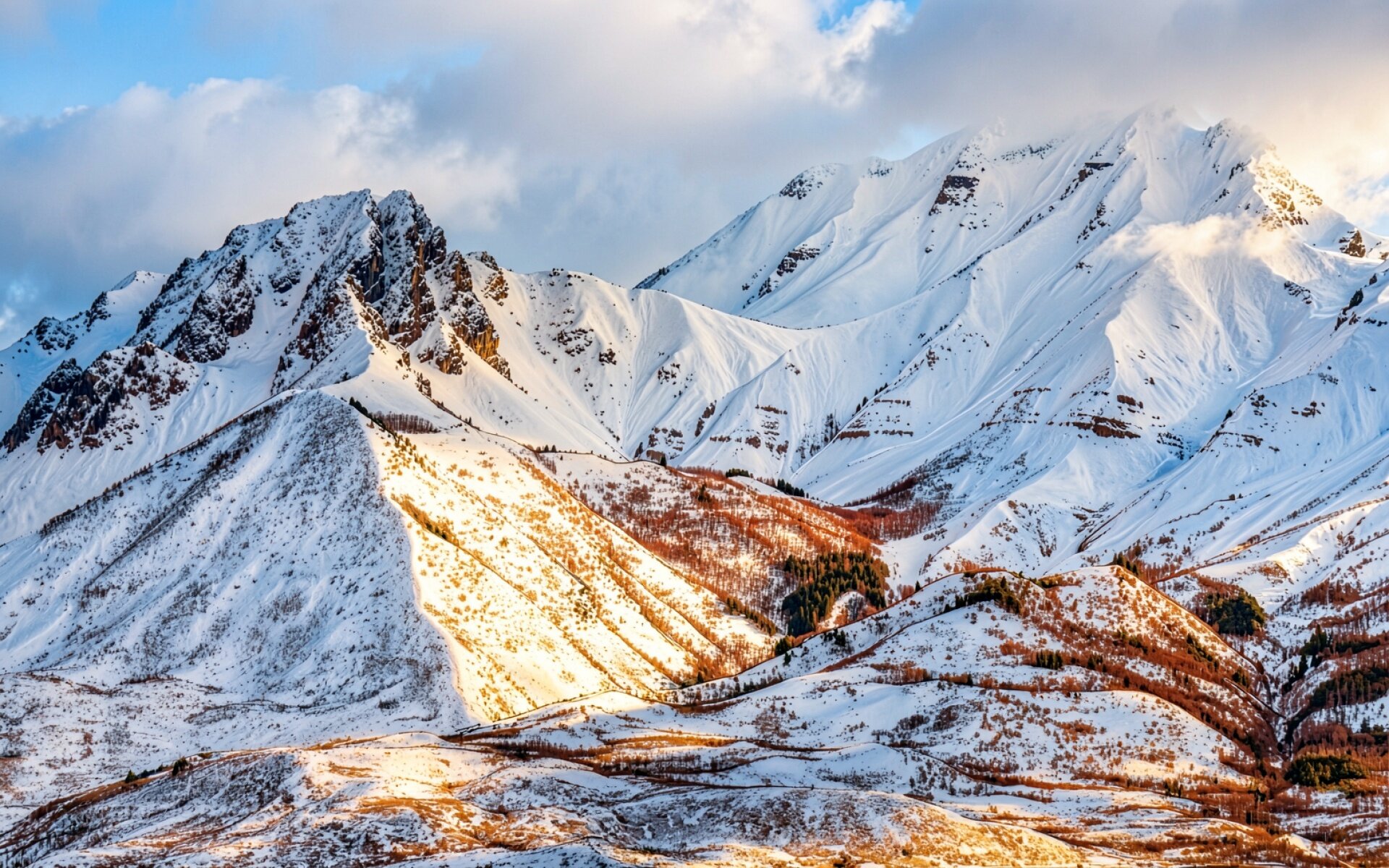 Техническое исполнение изображения подчеркивает контраст между холодными тенями в глубоких расщелинах и теплыми золотистыми бликами на склонах. Текстура свежевыпавшего снега передана через мягкие градиенты, а резкие линии хребтов создают выразительный ритм композиции. Освещение имитирует низкое положение солнца, что усиливает объем скальных пород и подчеркивает детализацию заснеженных пиков. Перед загрузкой на сайте доступен удобный предпросмотр для оценки качества отображения на вашем экране.