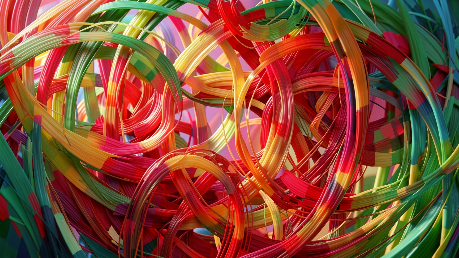 Изображение характеризуется сложной геометрией изогнутых элементов с выраженной глянцевой текстурой. Освещение создает четкие блики на изгибах линий, подчеркивая объем каждой нити и создавая глубокие тени в местах их пересечения. Цветовые градиенты плавно переходят от насыщенного красного к яркому зеленому и желтому, что формирует многослойный фон с высокой контрастностью. Перед загрузкой на сайте доступен удобный предпросмотр для оценки качества отображения на вашем экране.