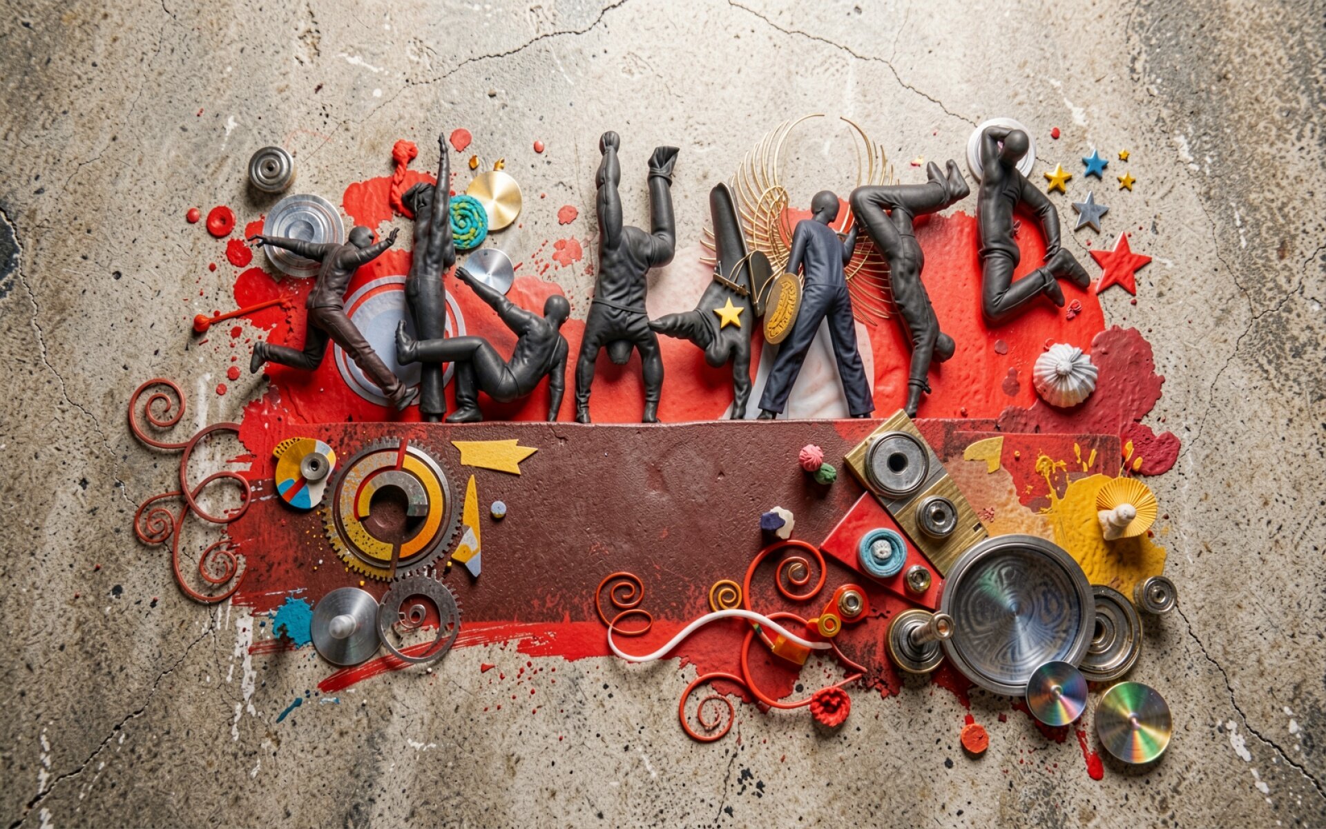 Техническое исполнение работы базируется на принципе многослойности и использовании текстур бетона и металла. В центре внимания находятся черные фигуры в экспрессивных позах, которые взаимодействуют с шестеренками, пружинами и CD-дисками. Подобный стиль напоминает концептуальный коллаж, где каждый объект служит метафорой взаимодействия человека и технологий. Согласно данным Adobe.com, использование высокого контраста между красным и черным цветами в цифровом искусстве максимально привлекает внимание зрителя за счет высокой визуальной интенсивности.