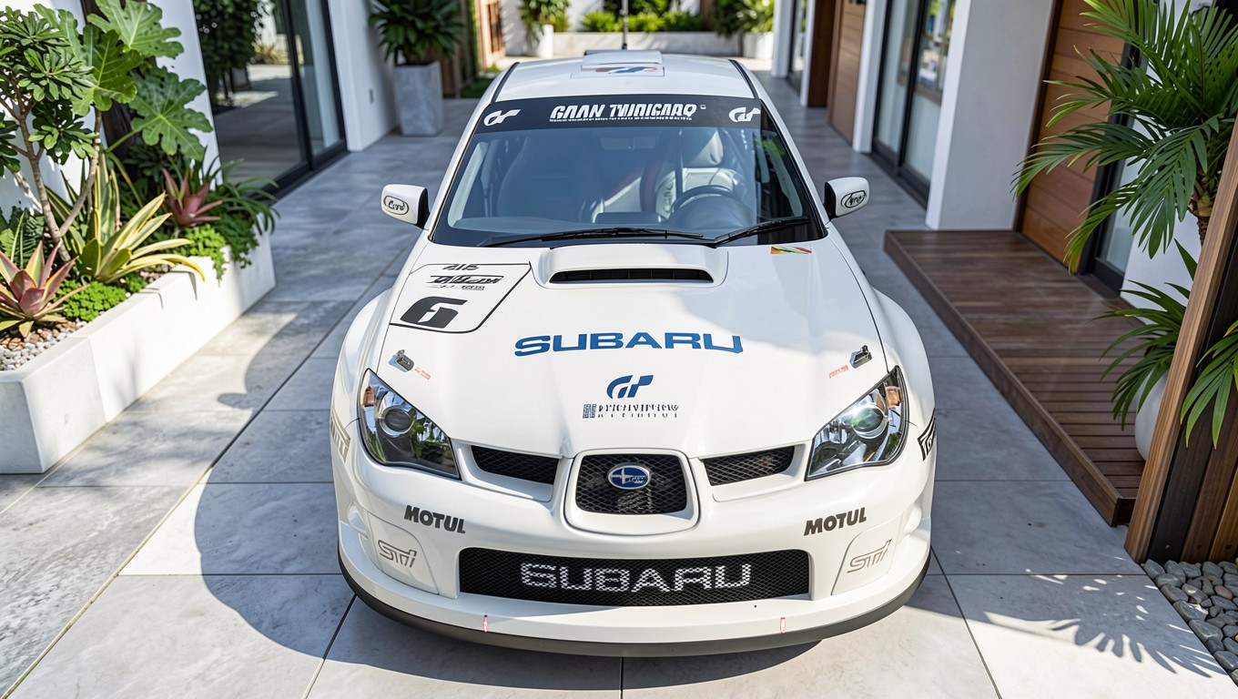 Белый гоночный автомобиль Subaru в современном интерьере обои